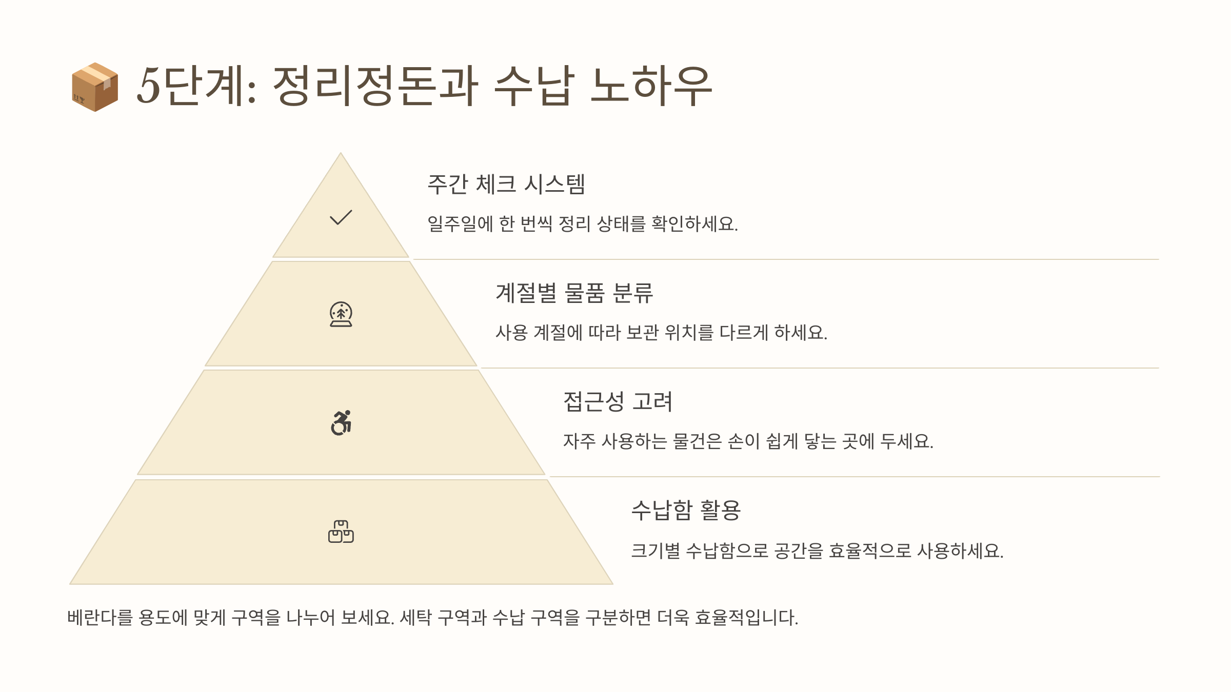 이 단계에서는 정리만으로도 베란다의 절반 이상이 변화된다는 걸 느끼게 될 거예요. 정리는 곧 마음의 청소이기도 하니까요. 🧺
