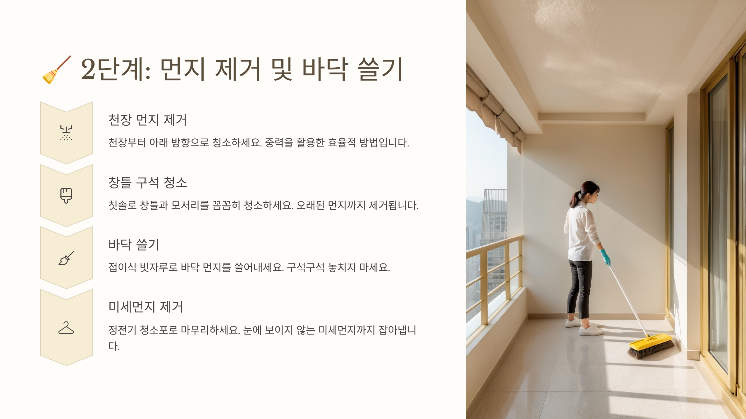 먼지 제거는 꼭 위에서 아래로 진행하는 게 좋아요. 벽면과 난간을 먼저 털고, 그 다음 바닥을 쓸면 더 효과적이에요. 구석에 숨어 있는 먼지는 브러시나 먼지털이개로 처리하면 좋아요.