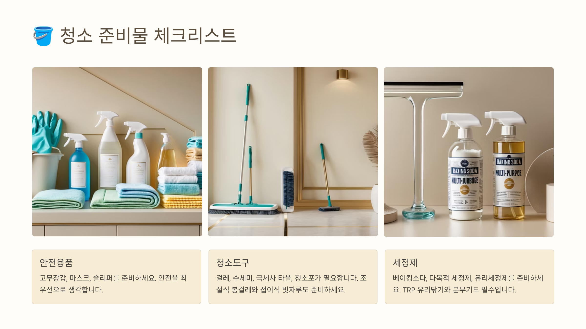 필요한 준비물은 아래와 같아요: 고무장갑, 빗자루와 쓰레받기, 걸레 2장 이상, 스프레이 세제, 유리창 청소 도구, 휴지통, 바닥용 브러시 또는 데크 브러시. 청소할 땐 장갑 착용을 꼭 해주세요!