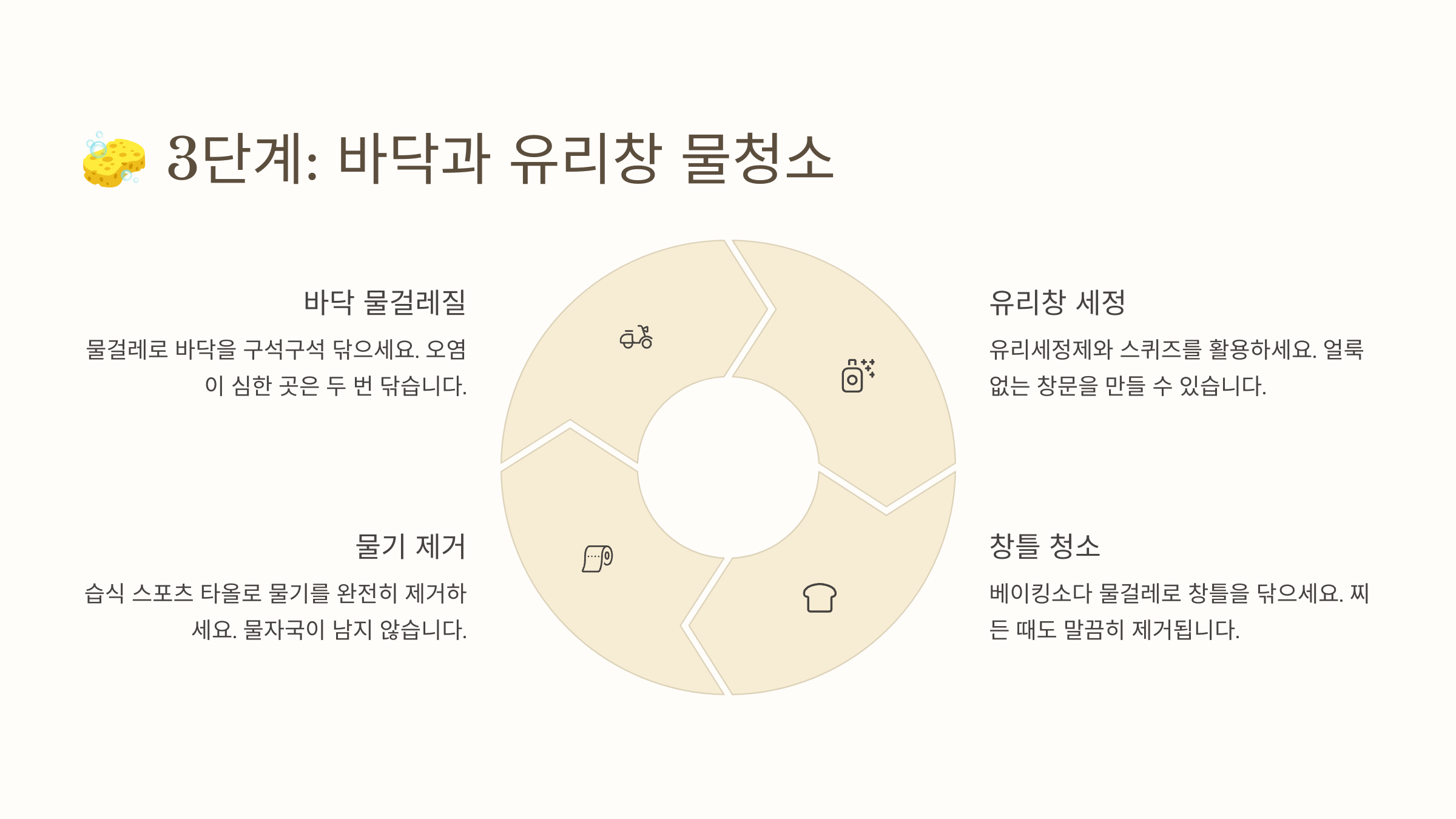 바닥은 물을 너무 많이 쓰지 않고 적당량으로 닦아주는 게 좋아요. 물기를 남기면 미끄럽고 곰팡이 생길 수 있어요. 브러시로 오염을 밀어내듯이 문질러주세요.