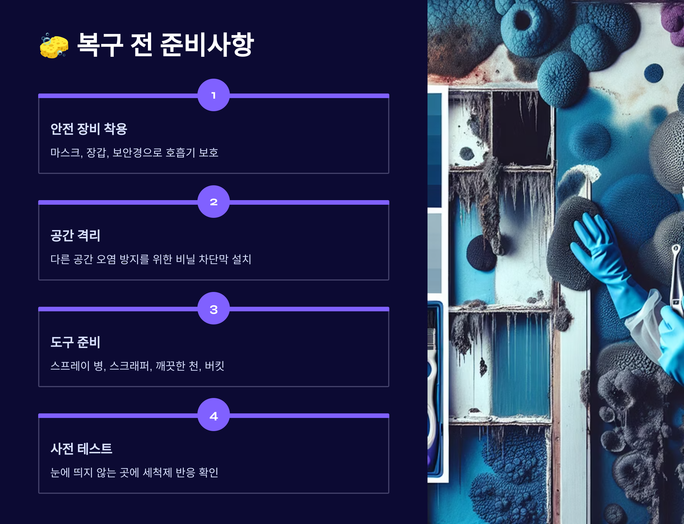 곰팡이 제거를 제대로 하려면 복구 전 준비 단계가 정말 중요해요. 그냥 닦기만 하면 안 되고, 표면에 손상을 주지 않으면서 곰팡이를 죽여야 하거든요. 준비가 잘 되면 복구가 70%는 성공한 셈이에요.