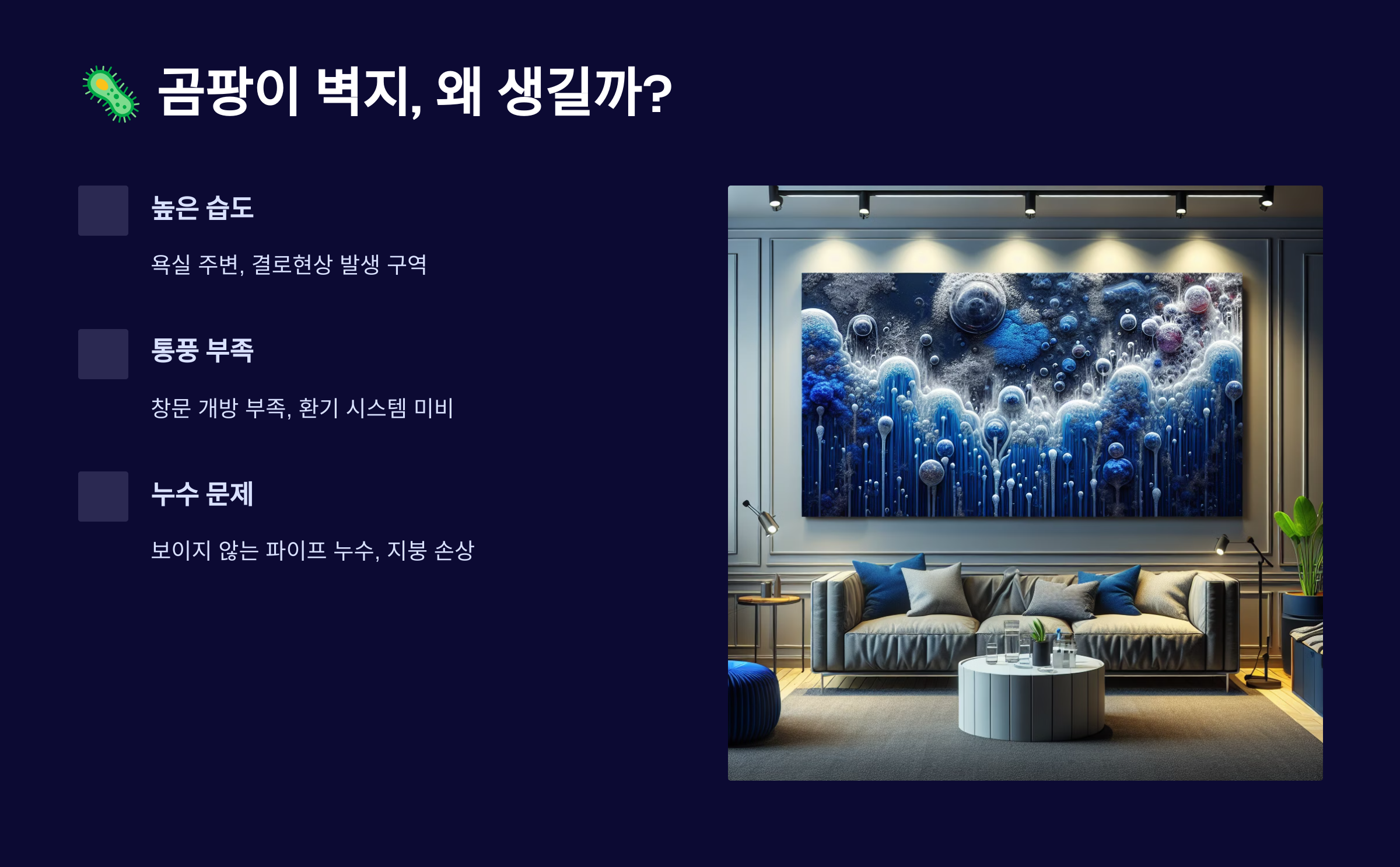 특히 벽지와 벽 사이에 생긴 작은 틈이나, 눈에 잘 보이지 않는 미세한 균열에서도 곰팡이는 뿌리를 내려요. 물이 스며들기만 하면 바로 번식이 시작되는 구조죠.