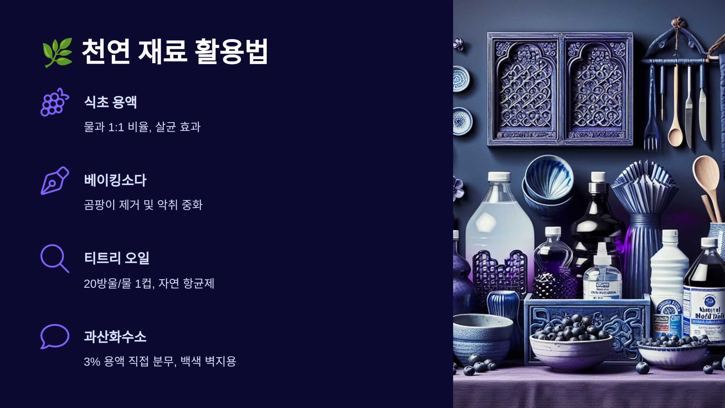 곰팡이 제거에 꼭 화학제품만 써야 하는 건 아니에요. 자극이 덜한 천연 재료만으로도 충분히 효과를 볼 수 있답니다. 아이, 반려동물이 있는 집이라면 오히려 천연 방법이 더 안전할 수 있어요.