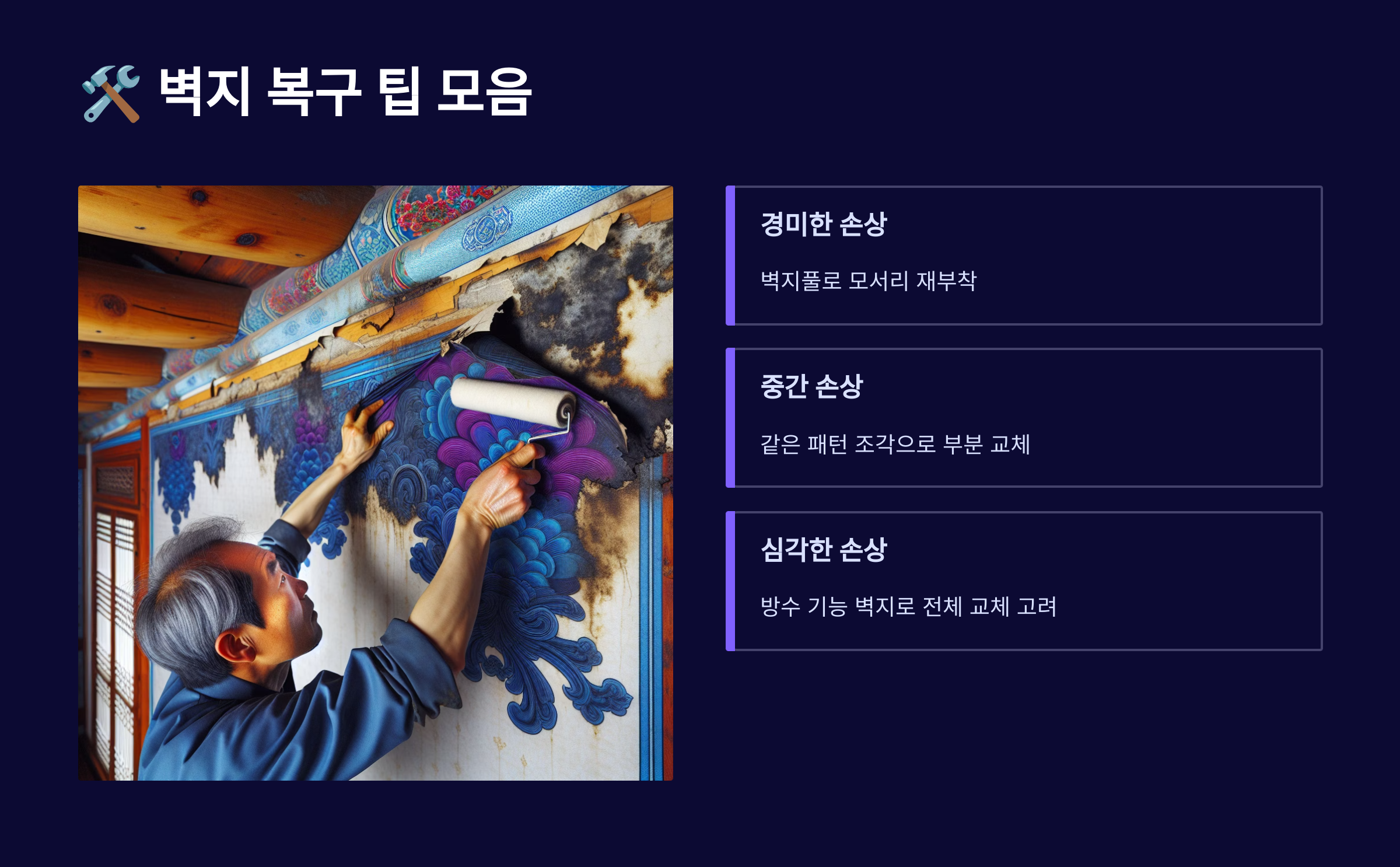 도배 없이 복구하는 핵심은 '지금 있는 벽지를 최대한 살리는 것'이에요. 작은 얼룩, 부분 손상은 간단한 도구로도 충분히 커버할 수 있어요. 이 단계만 잘 마무리하면 새 집처럼 보이는 건 시간 문제예요. 😉