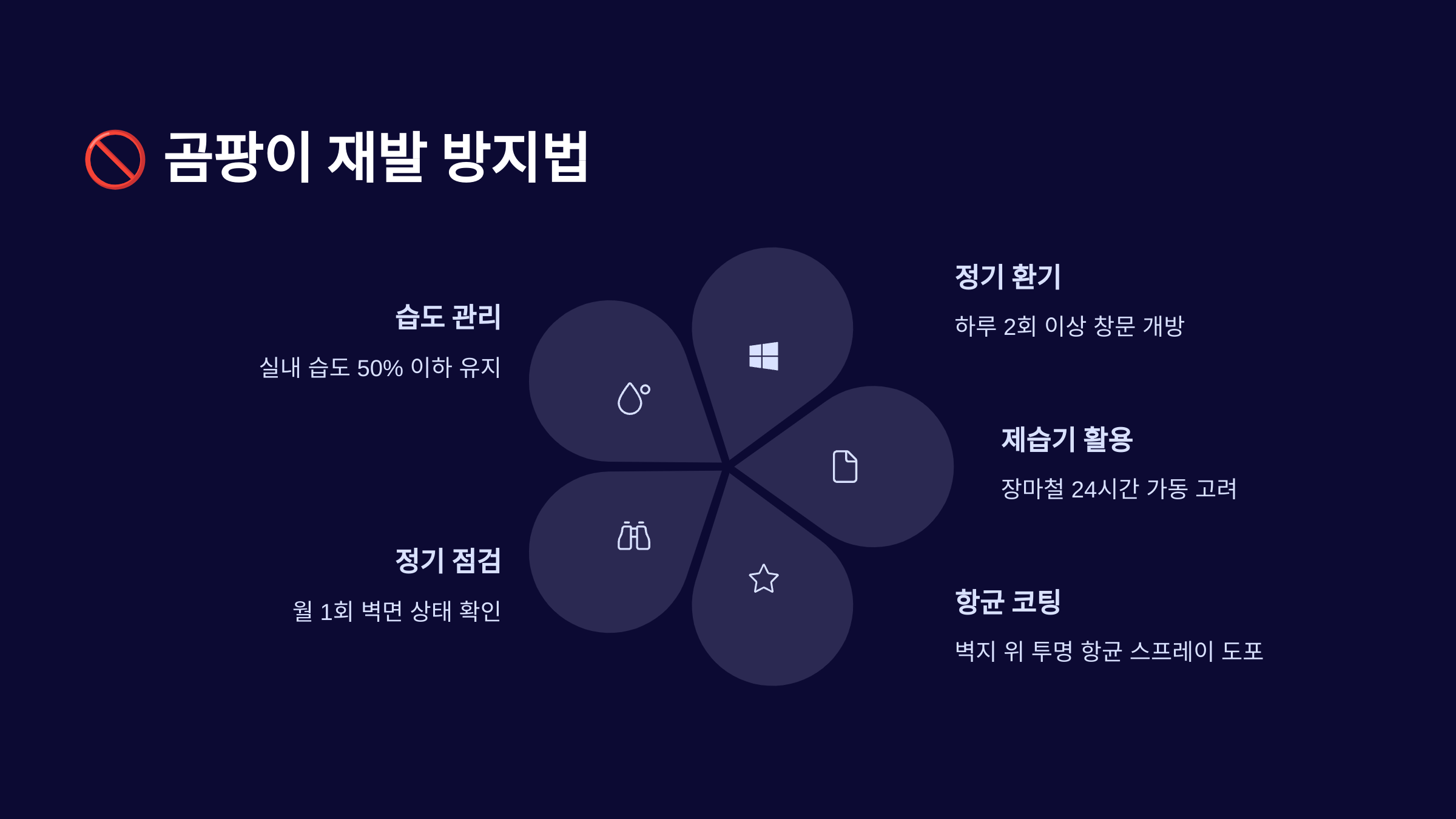 A3. 환기, 제습, 단열 개선, 방균 코팅제 사용이 중요해요. 습도 60% 이하로 유지하면 재발 확률을 크게 줄일 수 있어요.