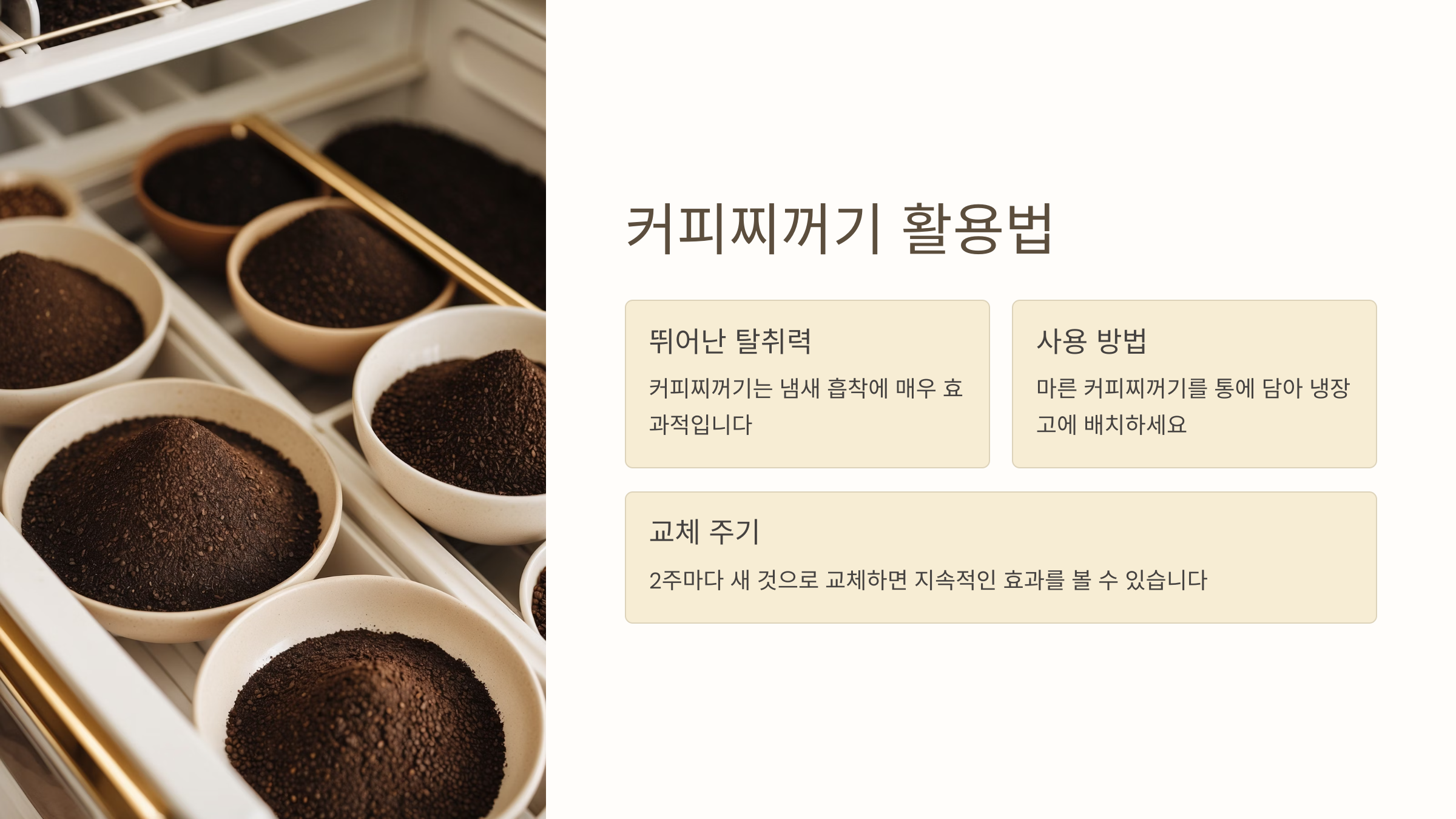 게다가 커피 찌꺼기는 재활용도 가능해서 환경에도 좋고, 김치냄새 뿐만 아니라 쓰레기통이나 신발장 냄새 제거에도 효과적이에요.