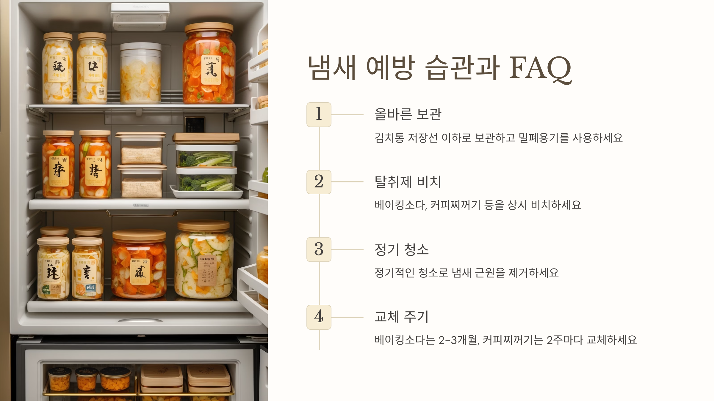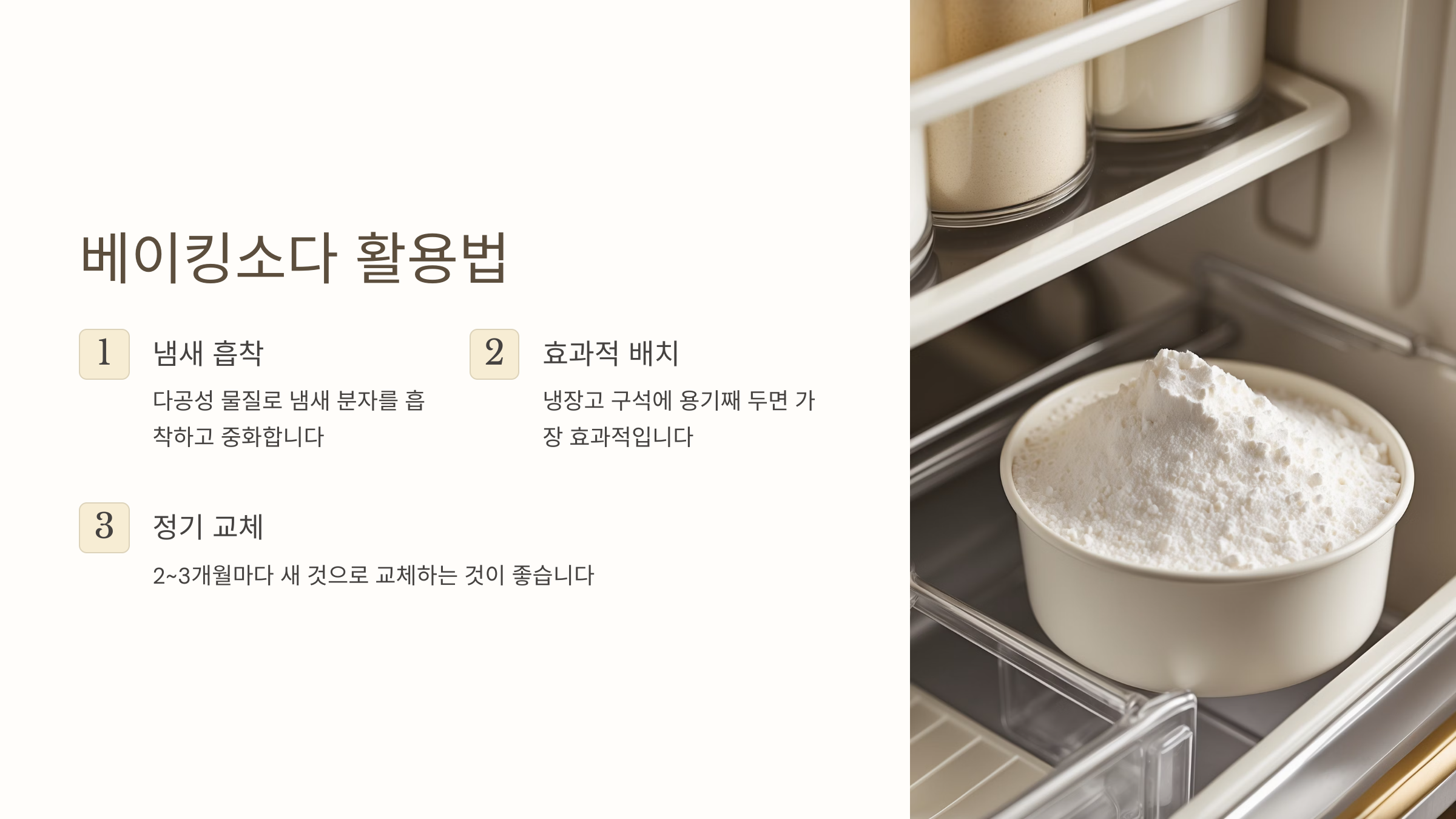 베이킹소다는 대표적인 염기성 물질로, 김치 냄새를 유발하는 산성 분자를 중화해요. 사용 방법은 정말 간단해요!