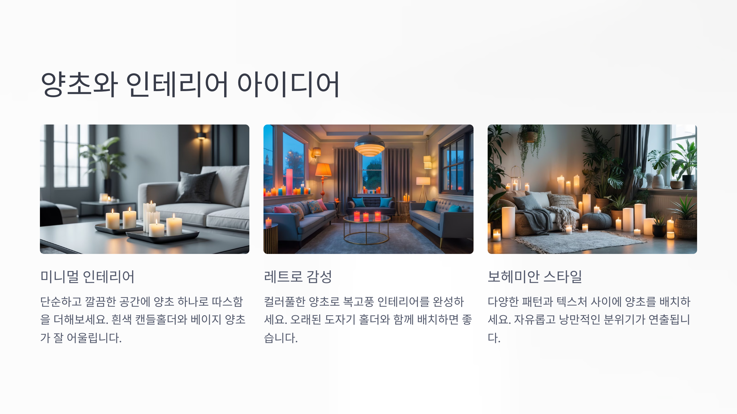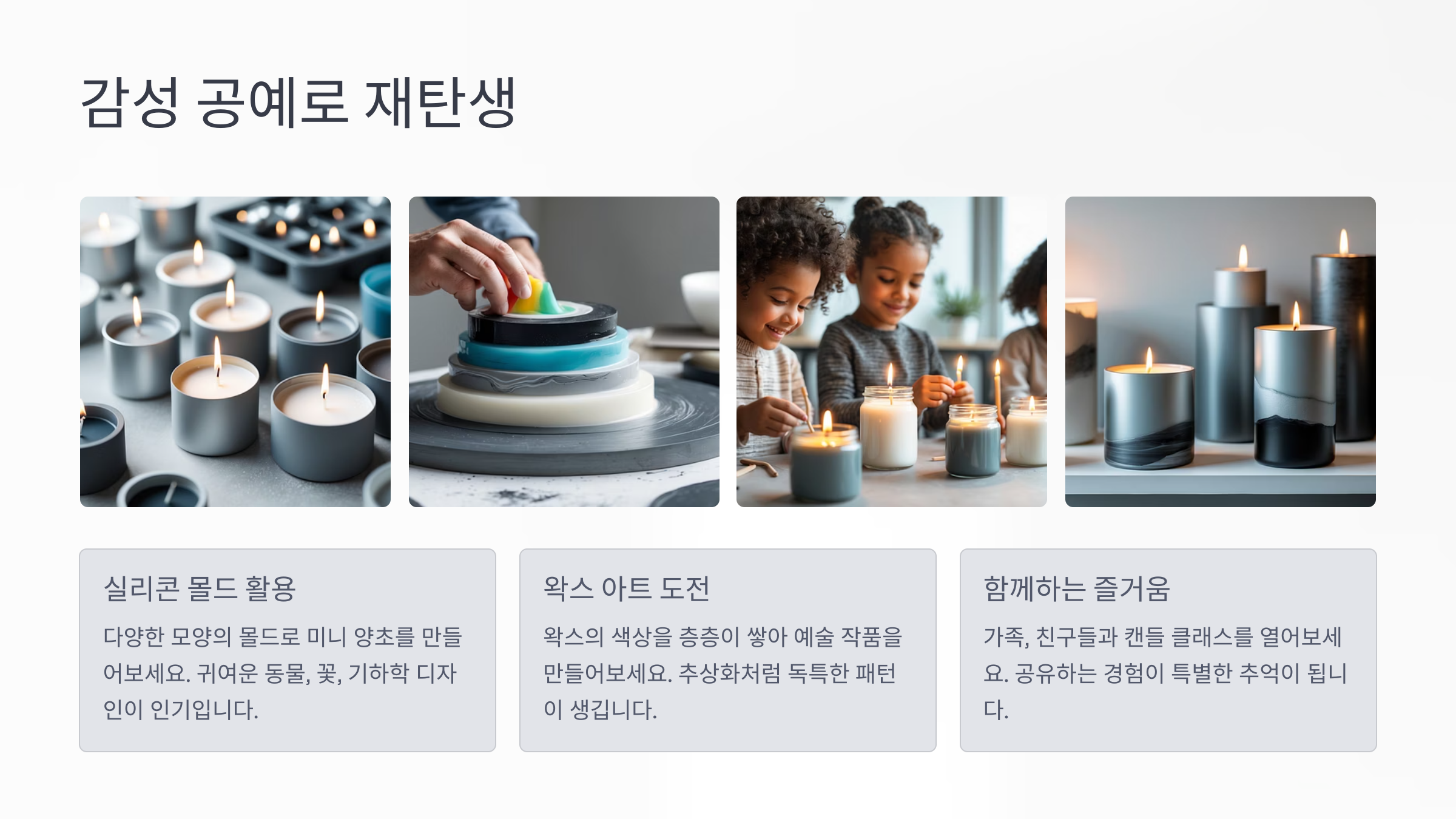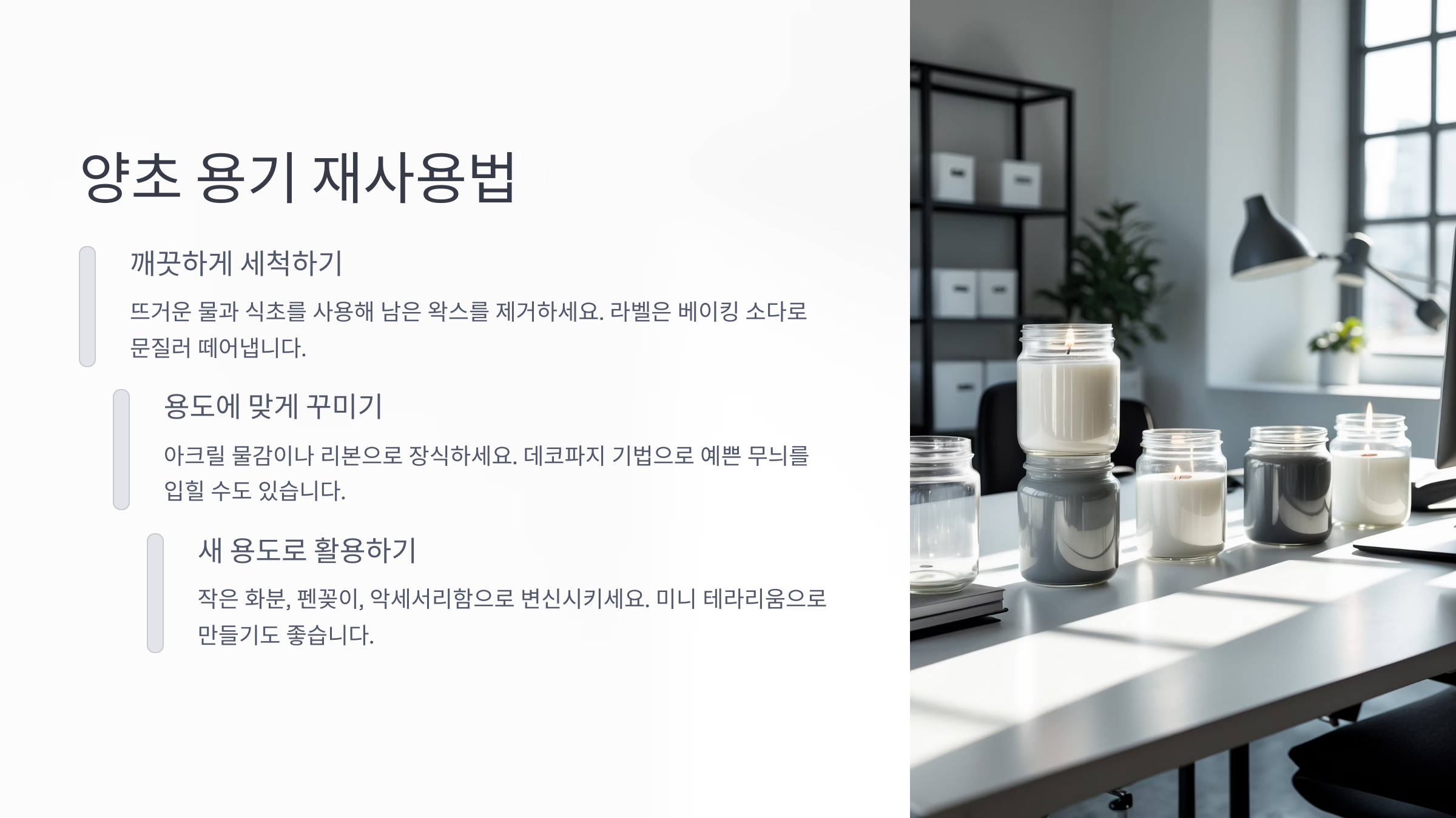 세 번째는 감성 인테리어 소품 제작이 가능하다는 점이에요. 기존 용기나 조명기구에 남은 양초를 이용해 자신만의 무드를 연출할 수 있어요. 특히 계절별 색감이나 향을 더해 맞춤형 인테리어 효과를 낼 수 있어요.
