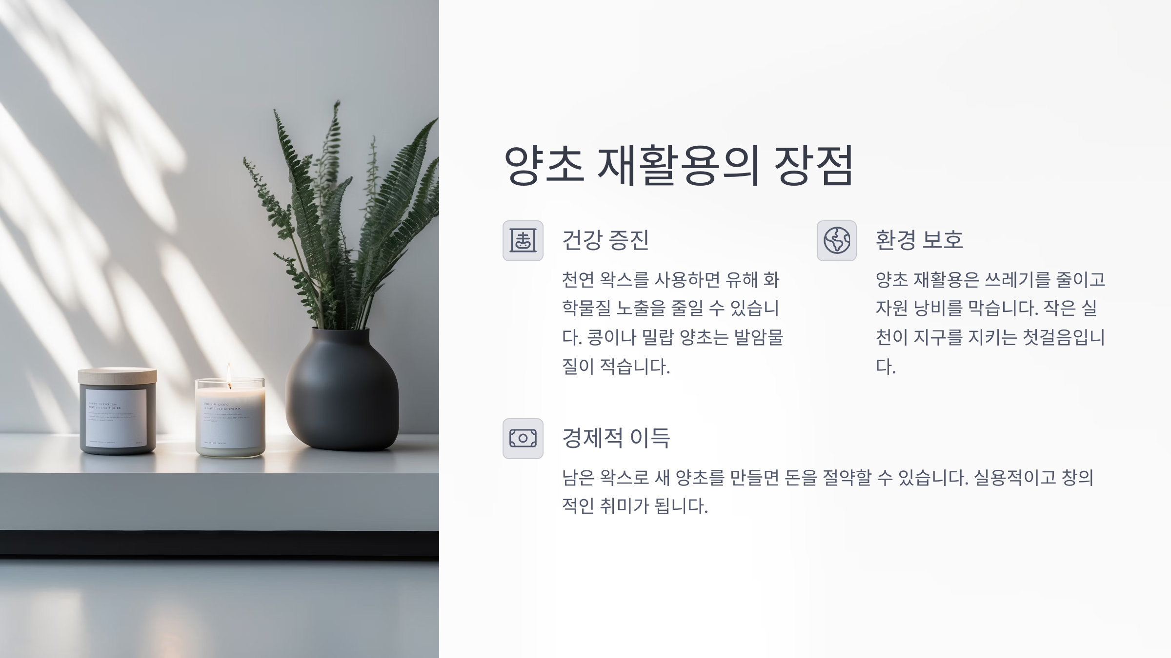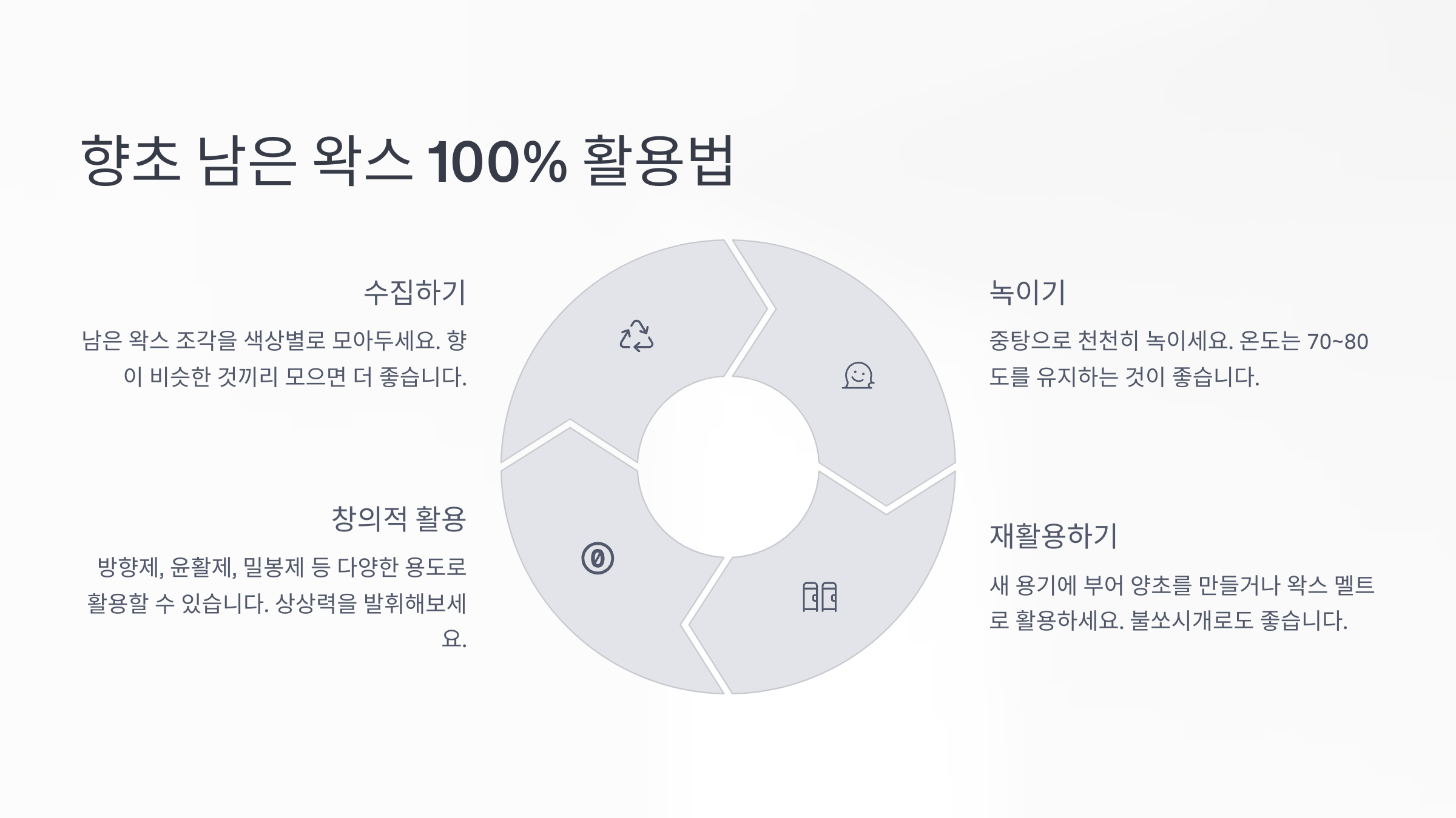 두 번째는 비용 절약이에요. 향초나 고급 양초는 가격이 꽤 비싼 편인데, 남은 왁스를 녹여 새로운 양초로 다시 만들면 추가 비용 없이 새 제품처럼 사용할 수 있어요. 실용성과 경제성을 모두 챙길 수 있는 거죠.