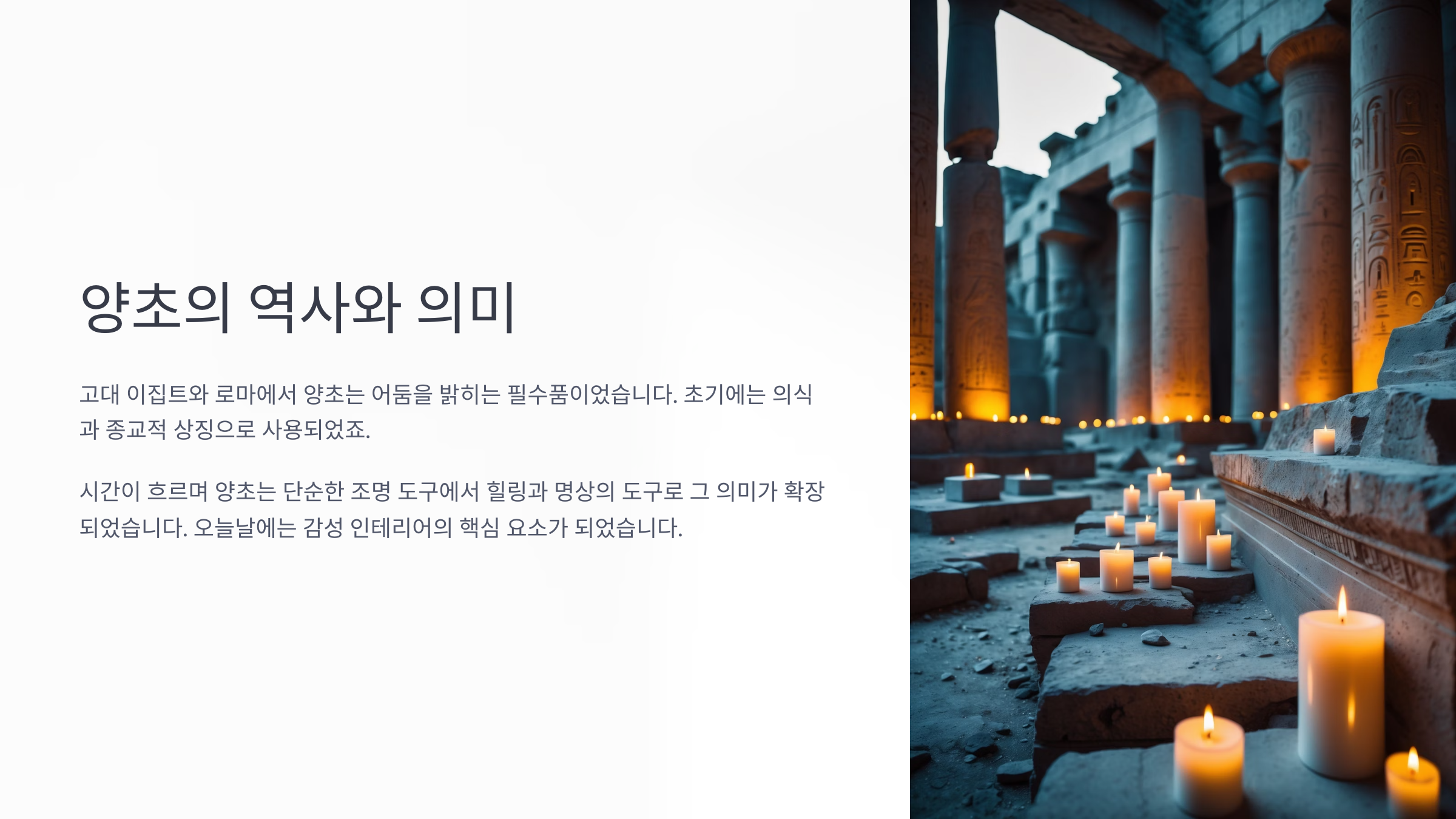 양초는 고대 이집트 시대부터 사용되어 온 생활 필수품이에요. 원래는 어두운 밤을 밝히기 위한 조명으로 시작되었지만, 시간이 지나면서 종교, 의식, 장식용으로도 활용되었답니다. 특히 중세 유럽에서는 벌집에서 추출한 밀랍으로 만든 양초가 귀족층의 상징이기도 했어요.