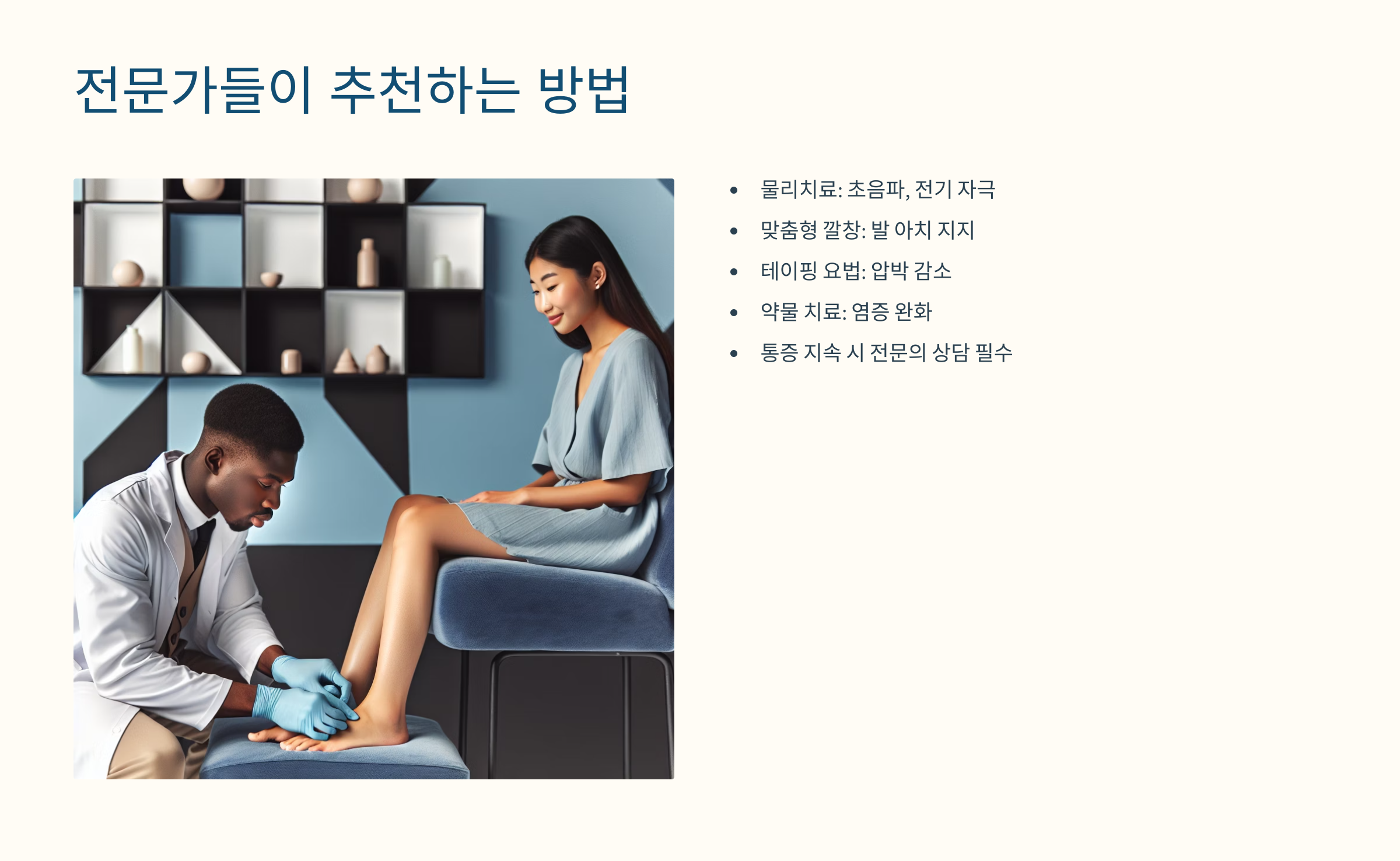첫 번째 전문 조언은 ‘족저근막 스트레칭 + 이완 치료 병행’이에요. 병원에서는 발바닥 근막을 부드럽게 늘려주는 스트레칭과 동시에 초음파나 전기자극 치료 등을 통해 염증을 완화시키는 복합요법을 많이 사용해요.