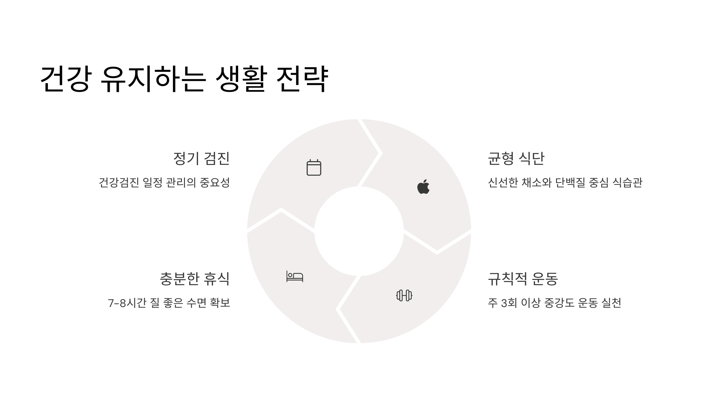 | 마음가짐 | 스트레스 줄이기, 몸의 신호 귀 기울이기 |
