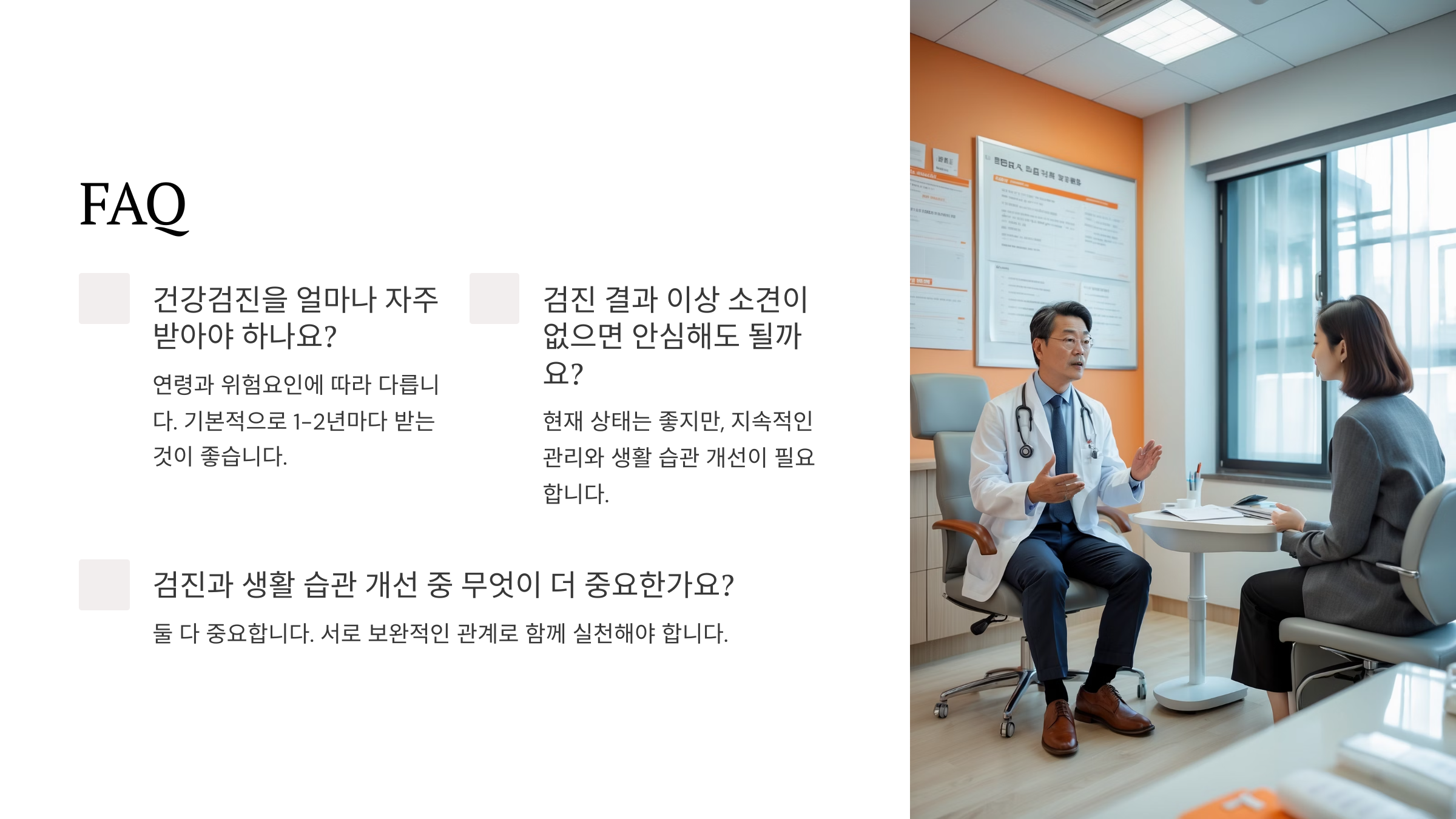 A1. 검진 항목의 한계와 생활습관의 차이가 있어요. 생활습관을 함께 보지 않으면 병을 놓치기 쉬워요.
