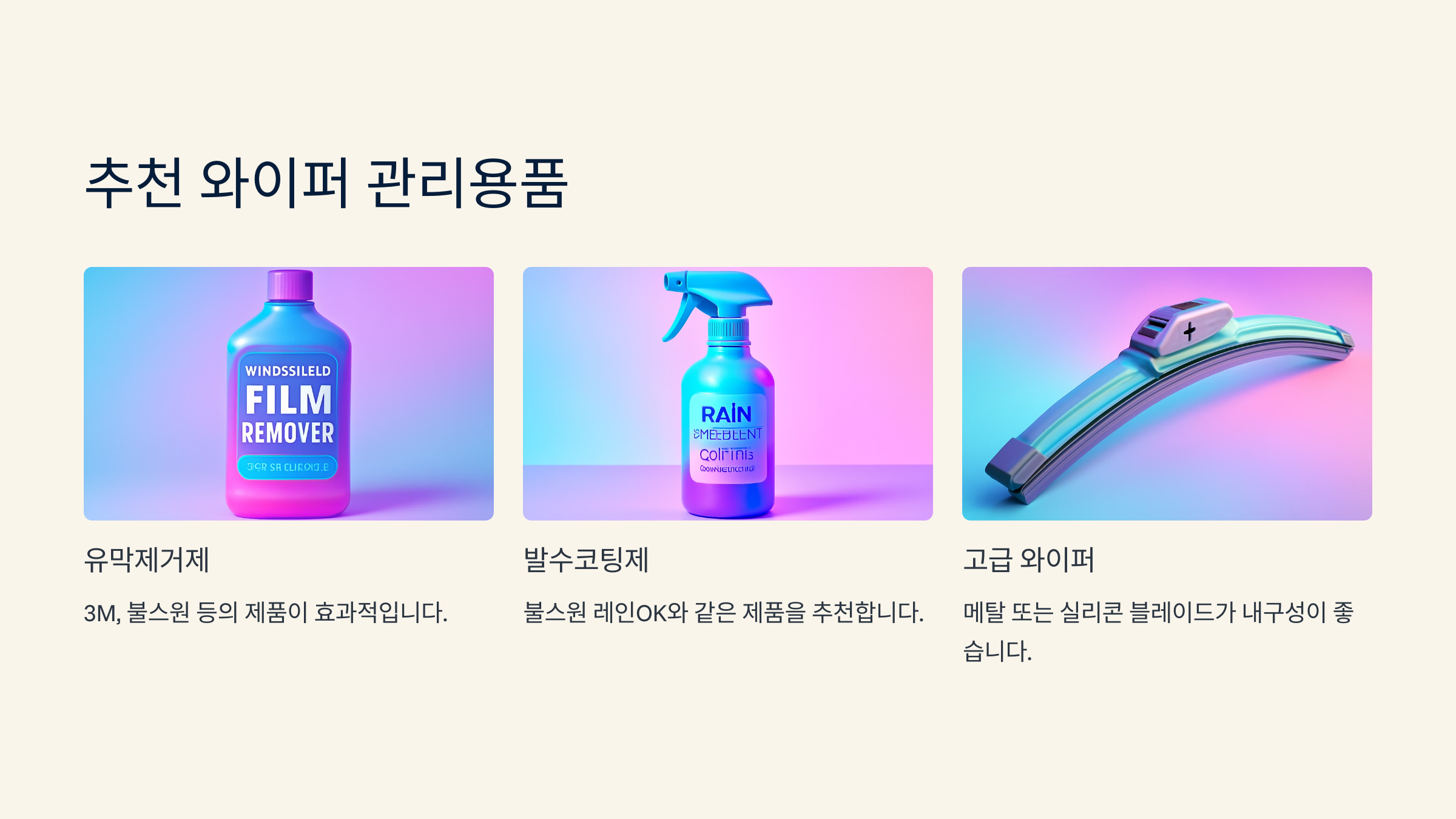 와이퍼를 오래 쓰고, 비 오는 날 소음을 줄이려면 좋은 관리용품 선택이 중요해요. 시중에는 다양한 제품이 있지만 기능이 제각각이기 때문에 제대로 알고 골라야 효과가 확실해요. 😊