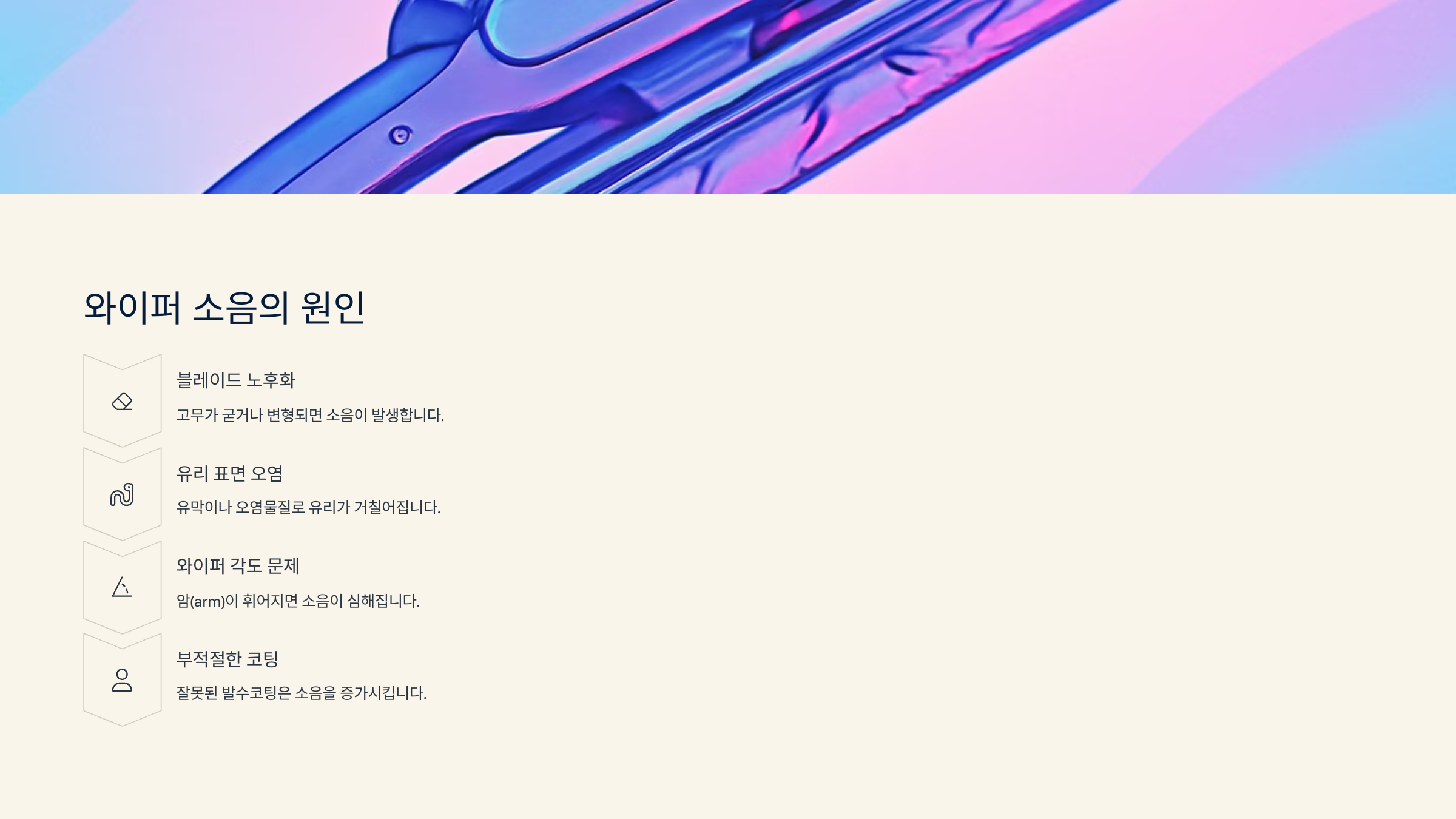 Q1. 와이퍼에서 유리 긁는 소리가 나요. 고장인가요?