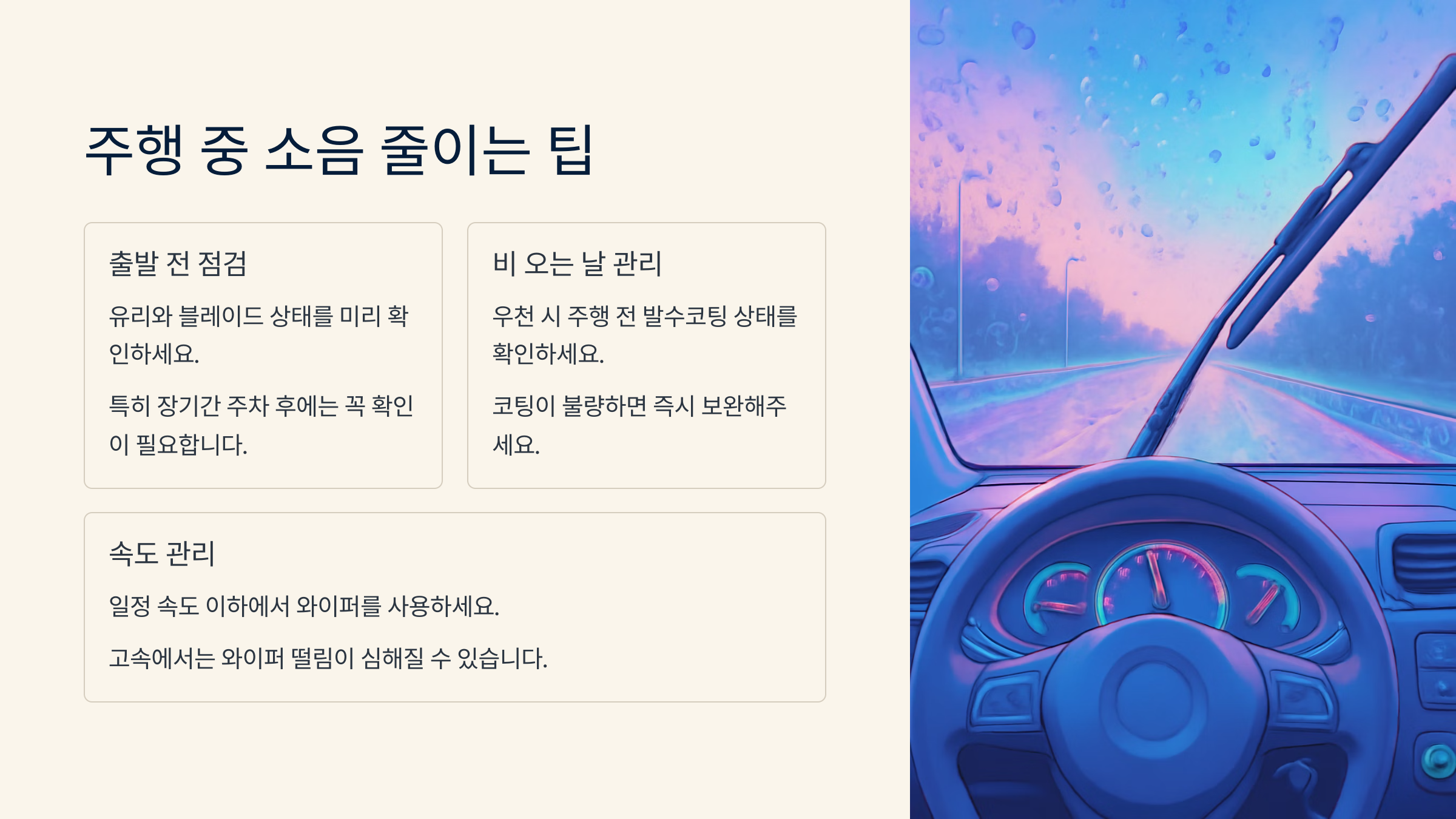 비 오는 날, 아무리 와이퍼를 새로 바꾸고 유리를 깨끗하게 관리해도 운전 습관이 좋지 않으면 소음이 다시 생길 수 있어요. 실제로 주행 중 와이퍼를 어떻게 작동하느냐에 따라 소리 차이가 꽤 크답니다. 🚗