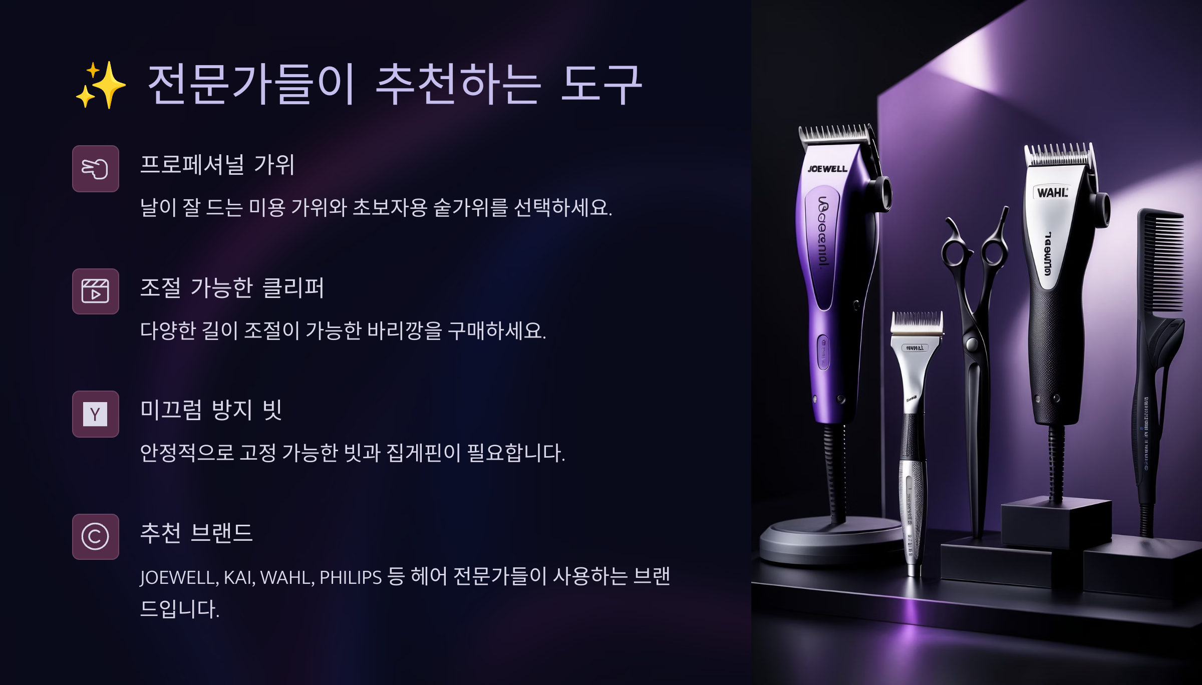 또한 전문가들은 “무조건 비싼 게 정답은 아니에요”라고도 말해요. 중요한 건 ‘자신의 손에 맞는지’, ‘커트할 스타일과 잘 맞는지’예요. 일본산 가위나 트리머는 확실히 품질이 뛰어나지만, 자신의 손에 맞지 않으면 오히려 불편할 수 있으니까 꼭 직접 잡아보고 결정해 보세요!