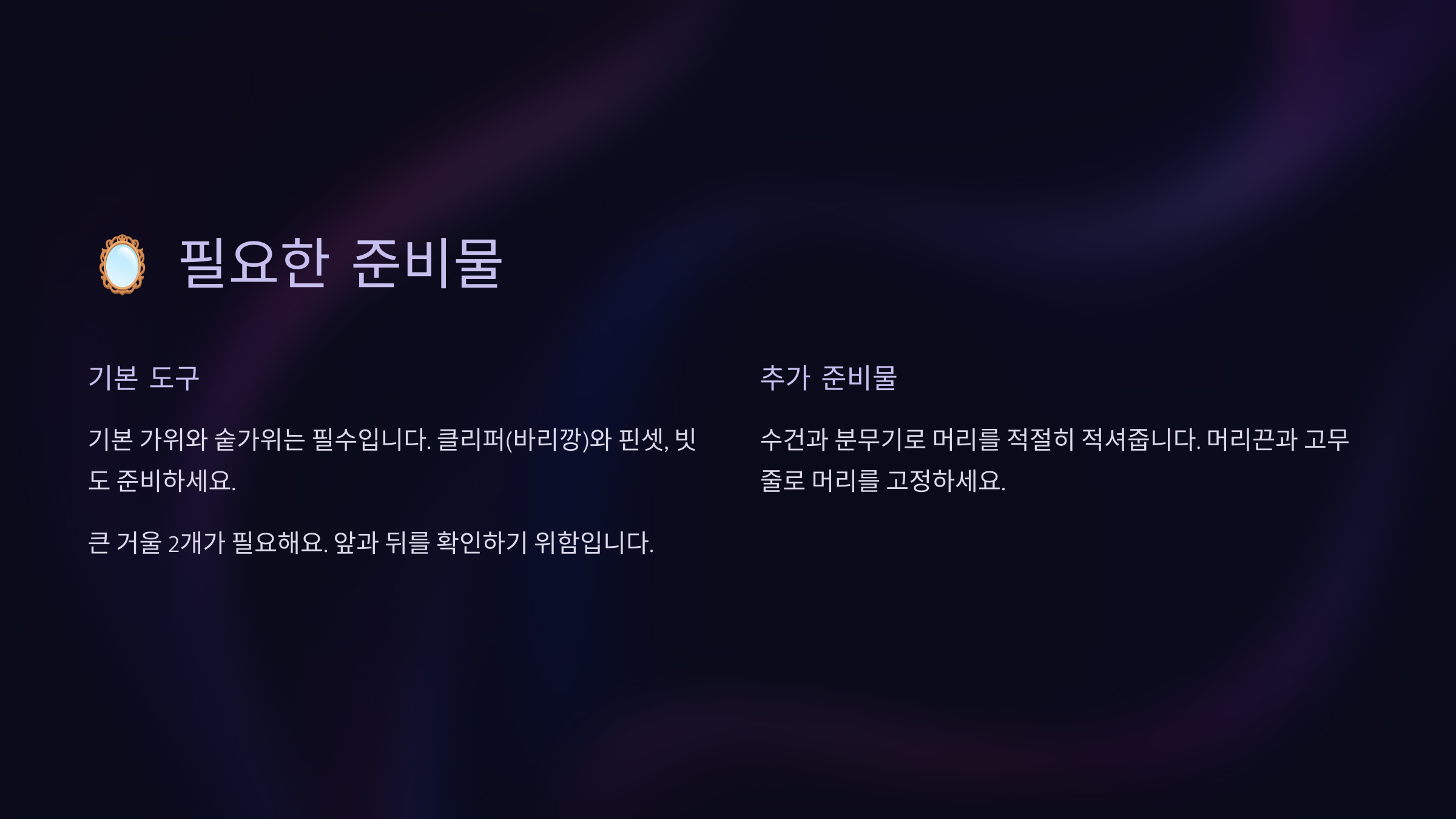 | 1. 준비 | 머리를 깨끗이 감고 말리기 |