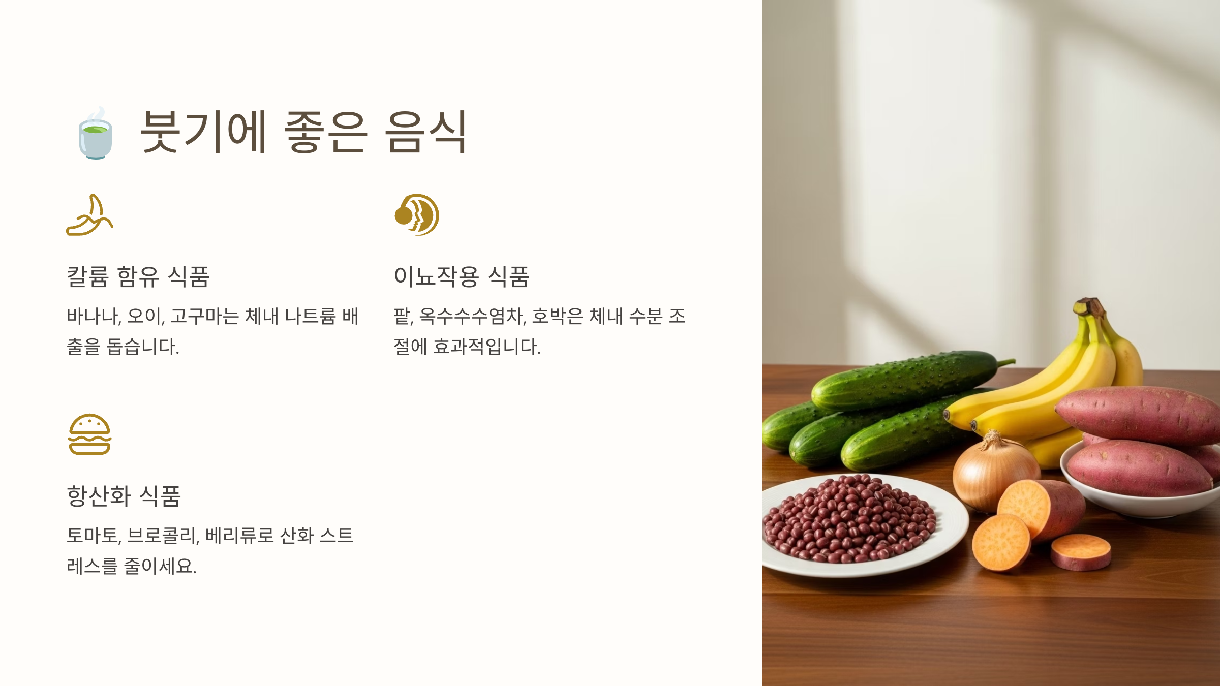 이런 음식들은 붓기뿐 아니라 피부 건강, 피로 해소에도 도움을 줘서 일석이조의 효과가 있어요. 매일 식단에 1~2가지씩만 추가해보세요. 😊