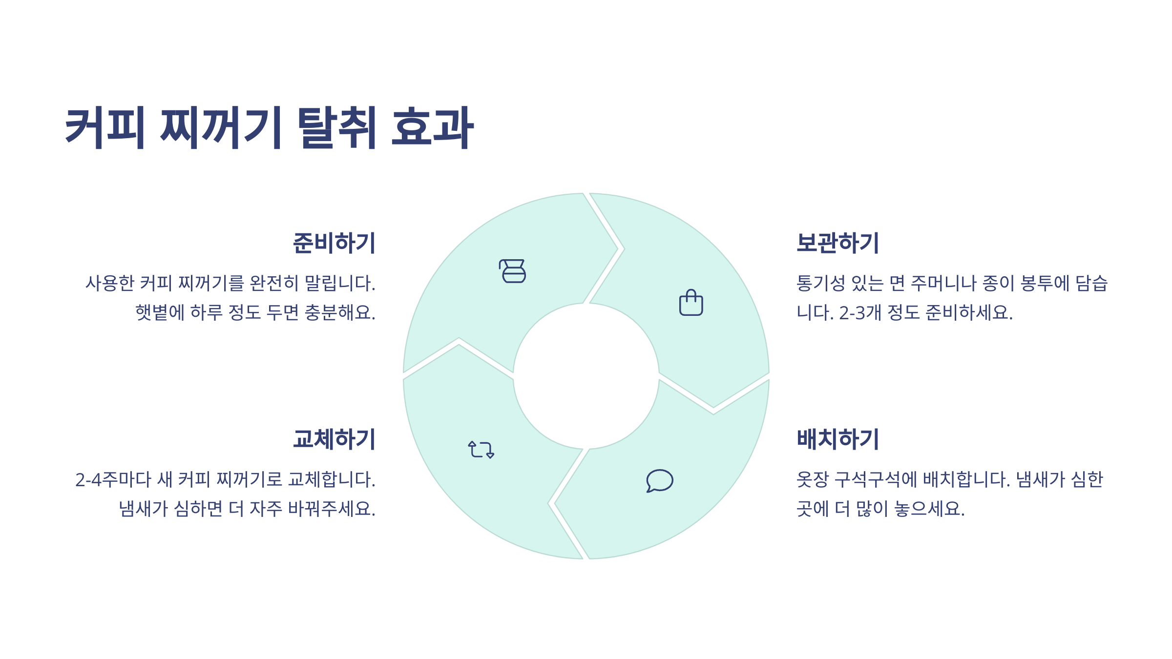 | 탈취제 교체 | 2~3주 | 천연 재료로 순환 사용 |