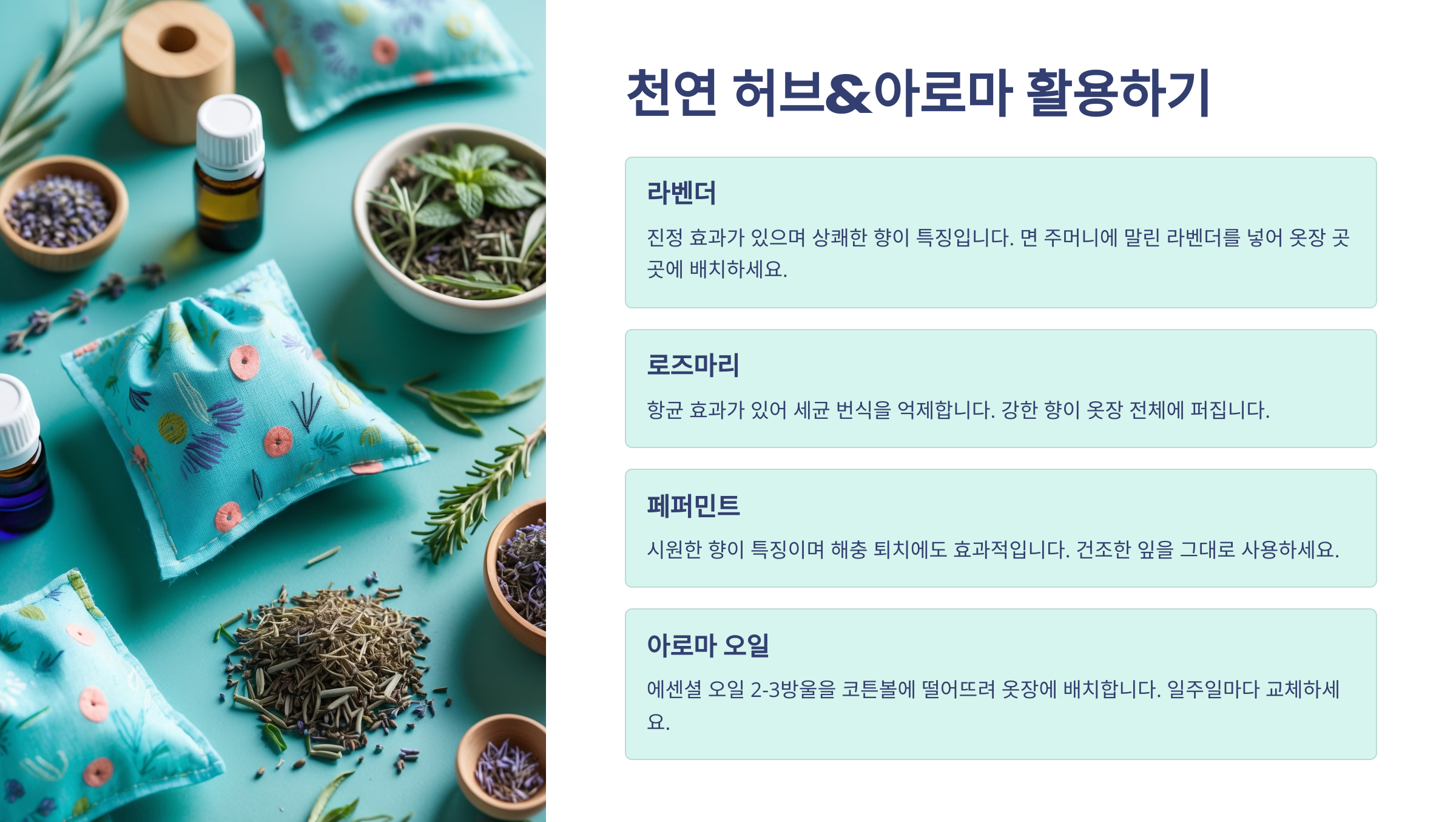 허브는 단순히 향기만 좋은 게 아니에요. 라벤더, 로즈마리, 유칼립투스 같은 허브는 살균과 방충 효과도 있어 옷장에 딱 좋은 천연 재료예요.