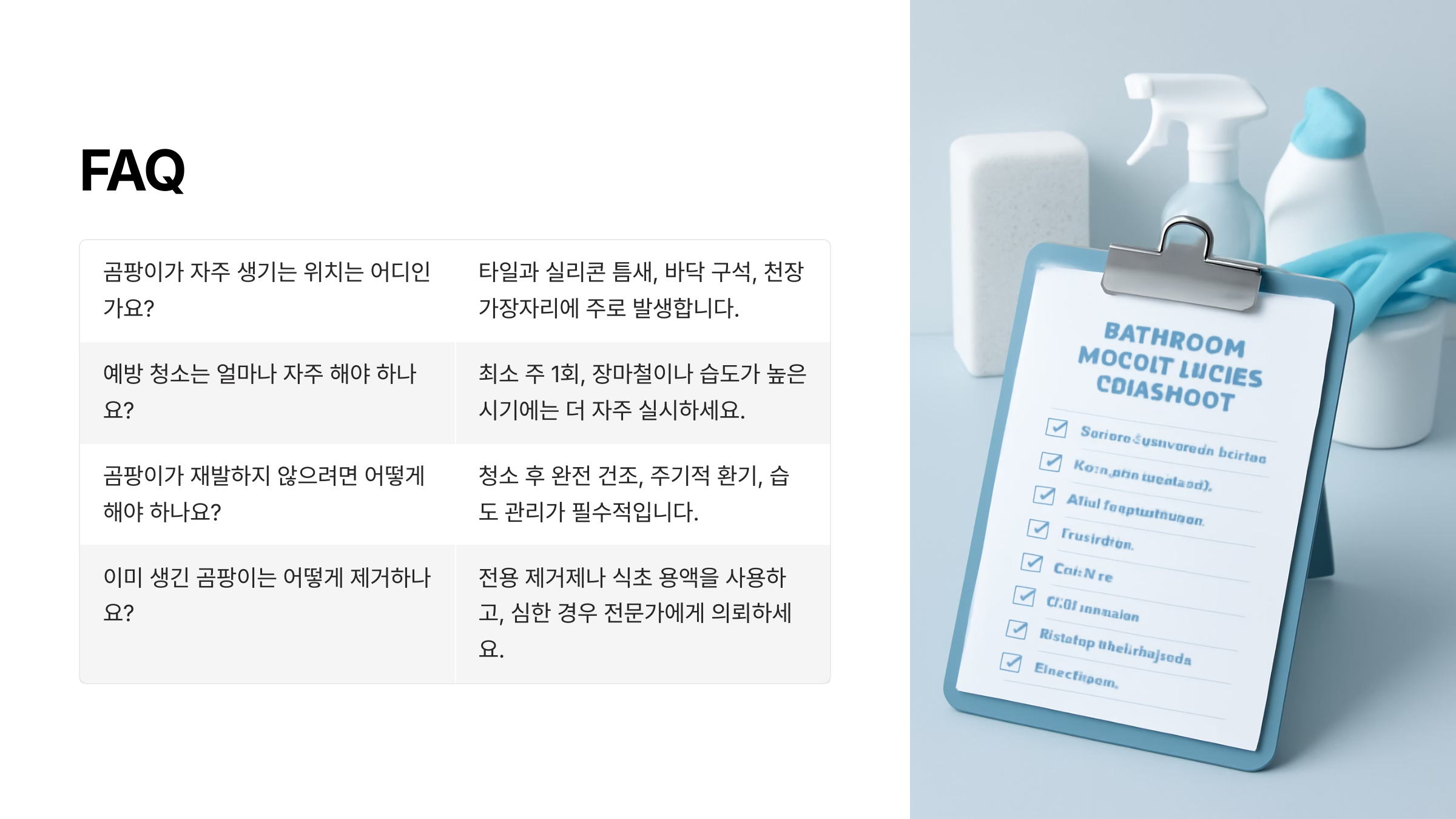 가족들과 함께 사용하는 욕실이라면 모두가 함께 실천할 수 있도록 '곰팡이 방지 체크리스트'를 만들어 벽에 붙여두는 것도 좋아요!