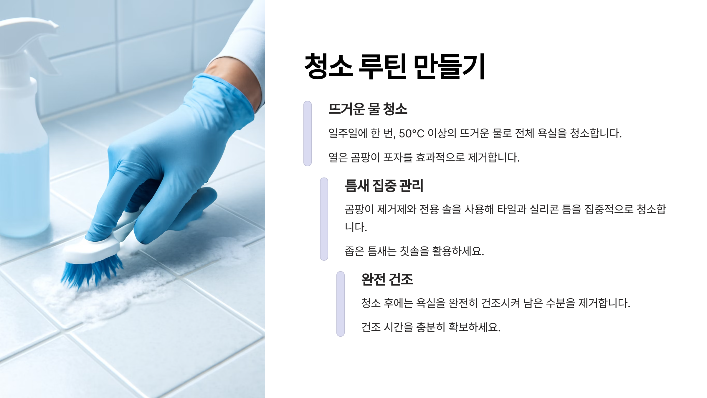 습기만 제거해도 곰팡이 예방에 도움이 되지만, 주기적인 청소 루틴이 더해지면 금상첨화예요. 일주일에 한 번은 욕실 전체를 꼼꼼히 청소해 주세요.