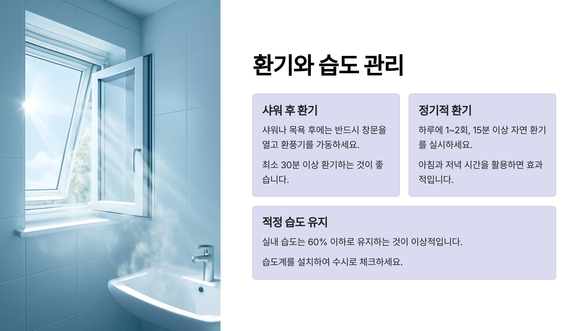 환기는 욕실 청결에서 가장 중요한 요소 중 하나예요. 곰팡이는 습한 환경에서 자라기 때문에 환기만 잘해도 절반은 예방할 수 있죠.