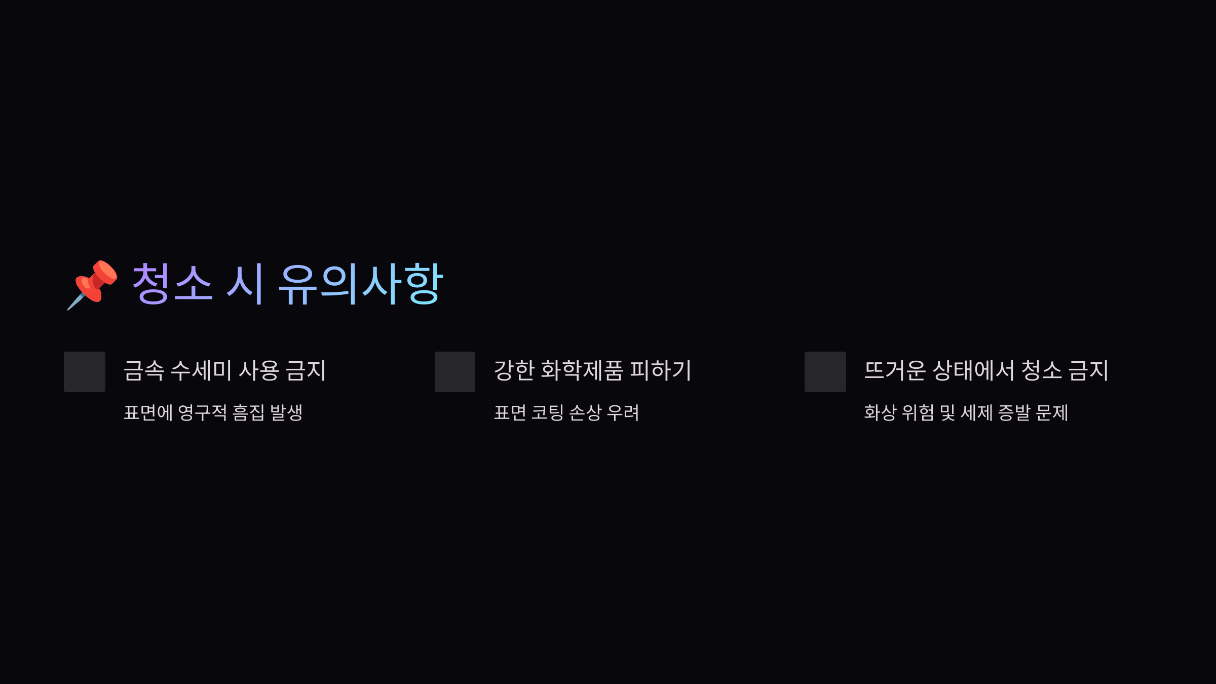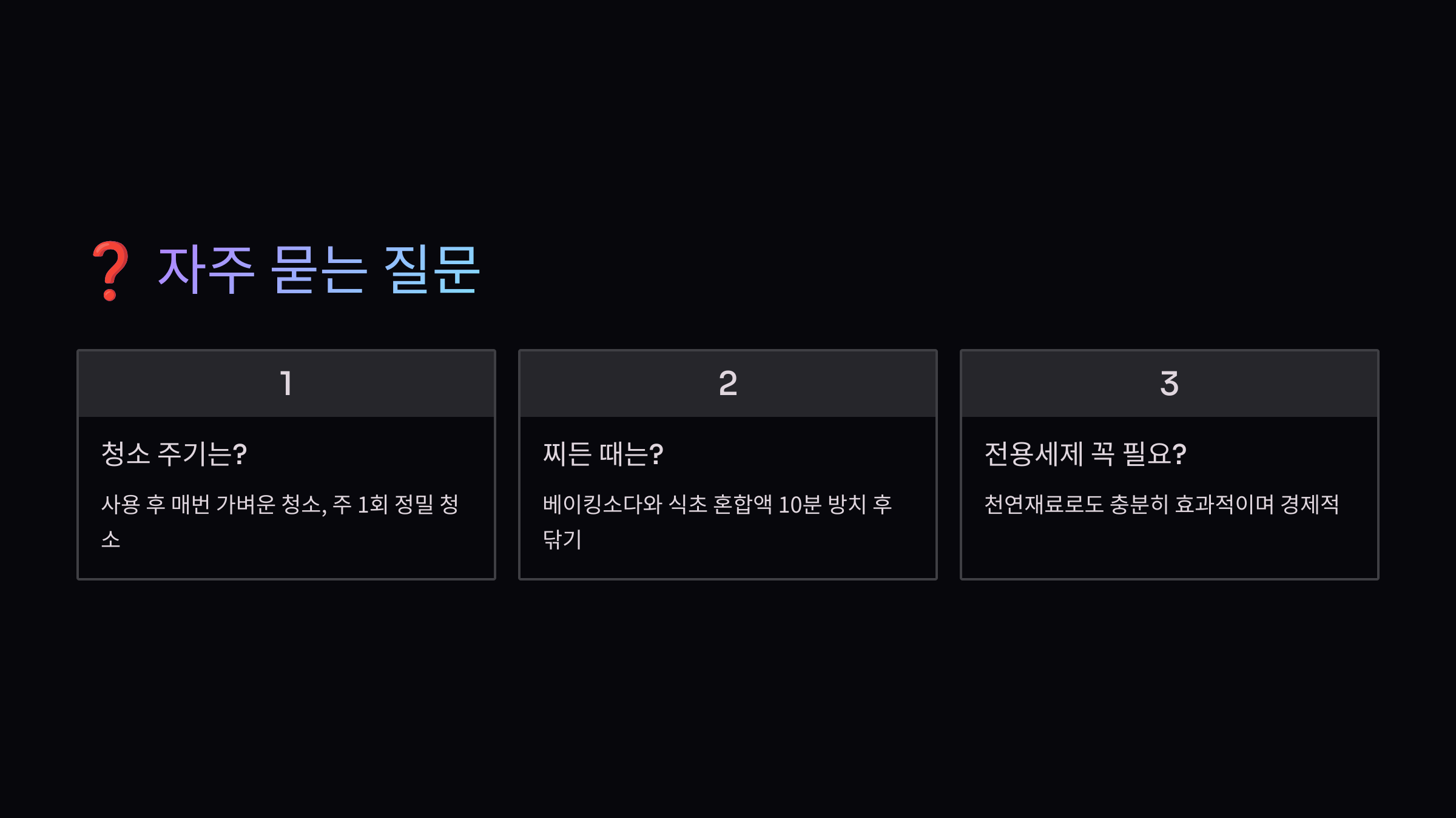 본 콘텐츠는 일반적인 청소 정보를 바탕으로 제공되며, 특정 제품 또는 제조사의 사양과 다를 수 있습니다. 사용 전 제품 설명서를 반드시 확인하고, 민감한 표면에는 사전 테스트를 권장합니다.