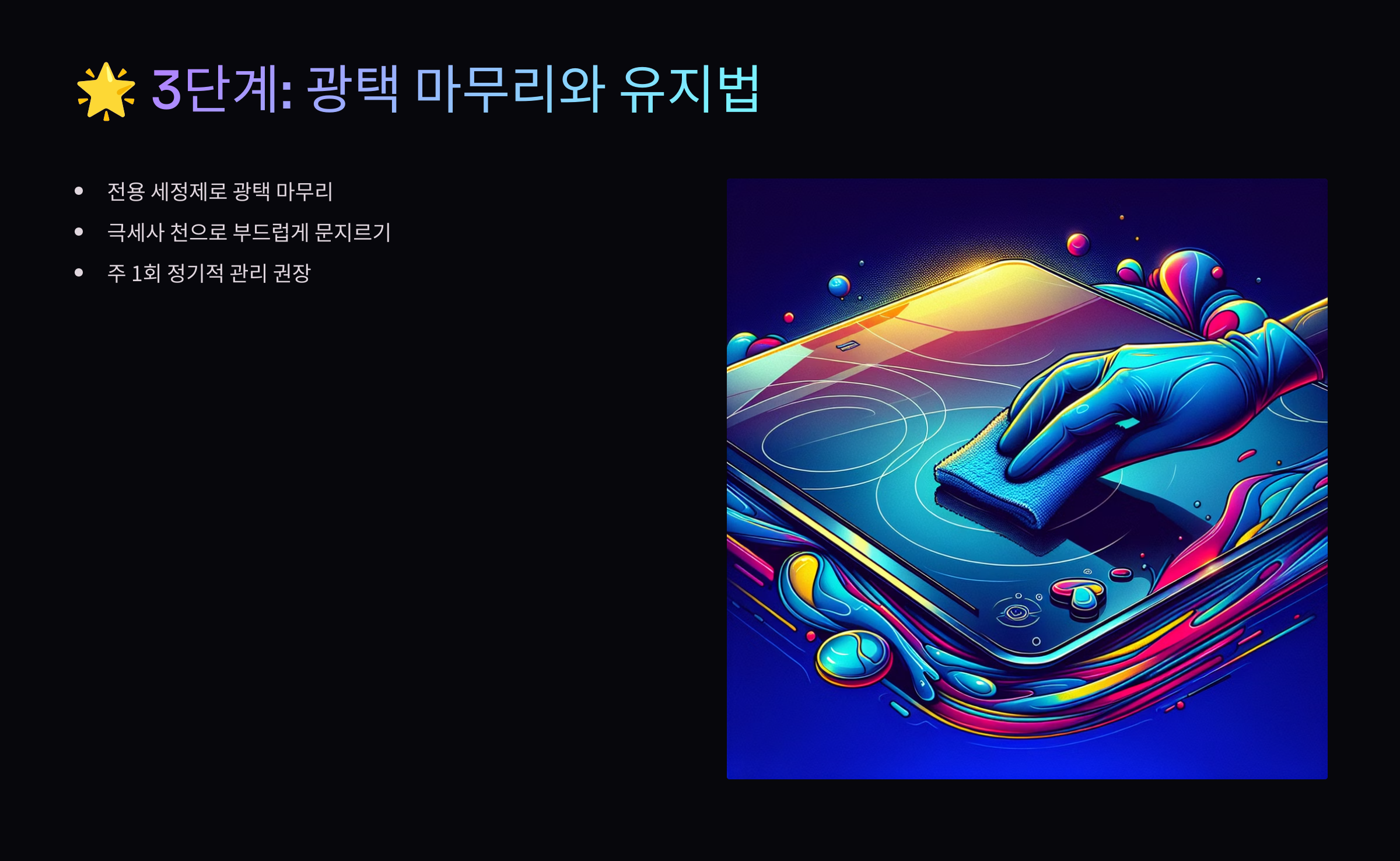 청소가 끝났다고 방심하면 안 돼요. 반짝이는 유리 표면을 오래 유지하려면 광택 관리가 꼭 필요하답니다.