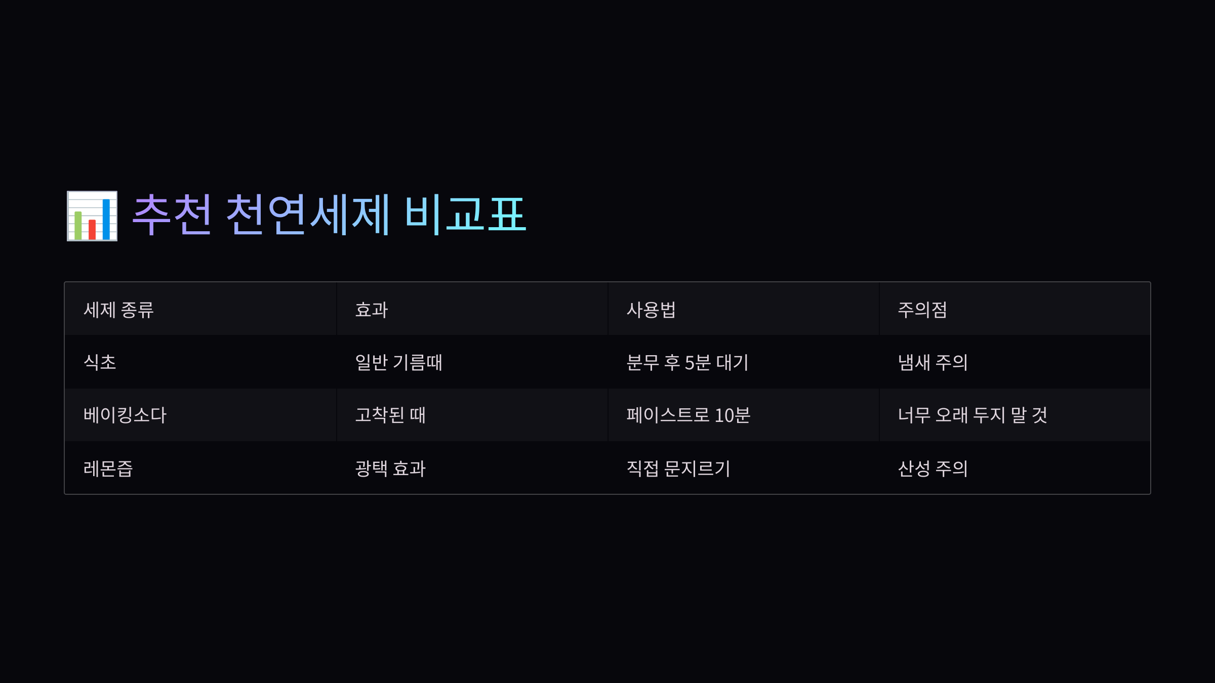 | 레몬즙 | 산성 성분으로 얼룩 제거 | 향기와 미세한 얼룩 정리 |