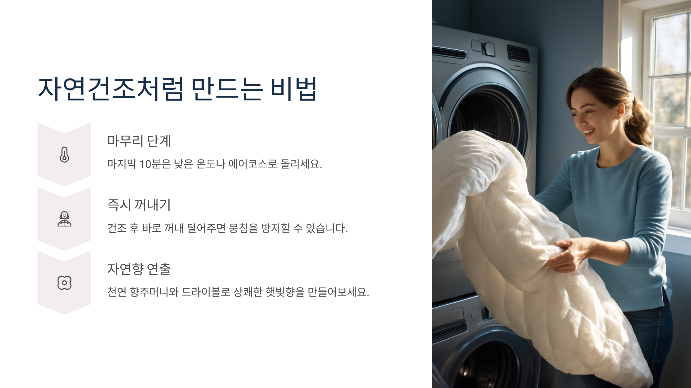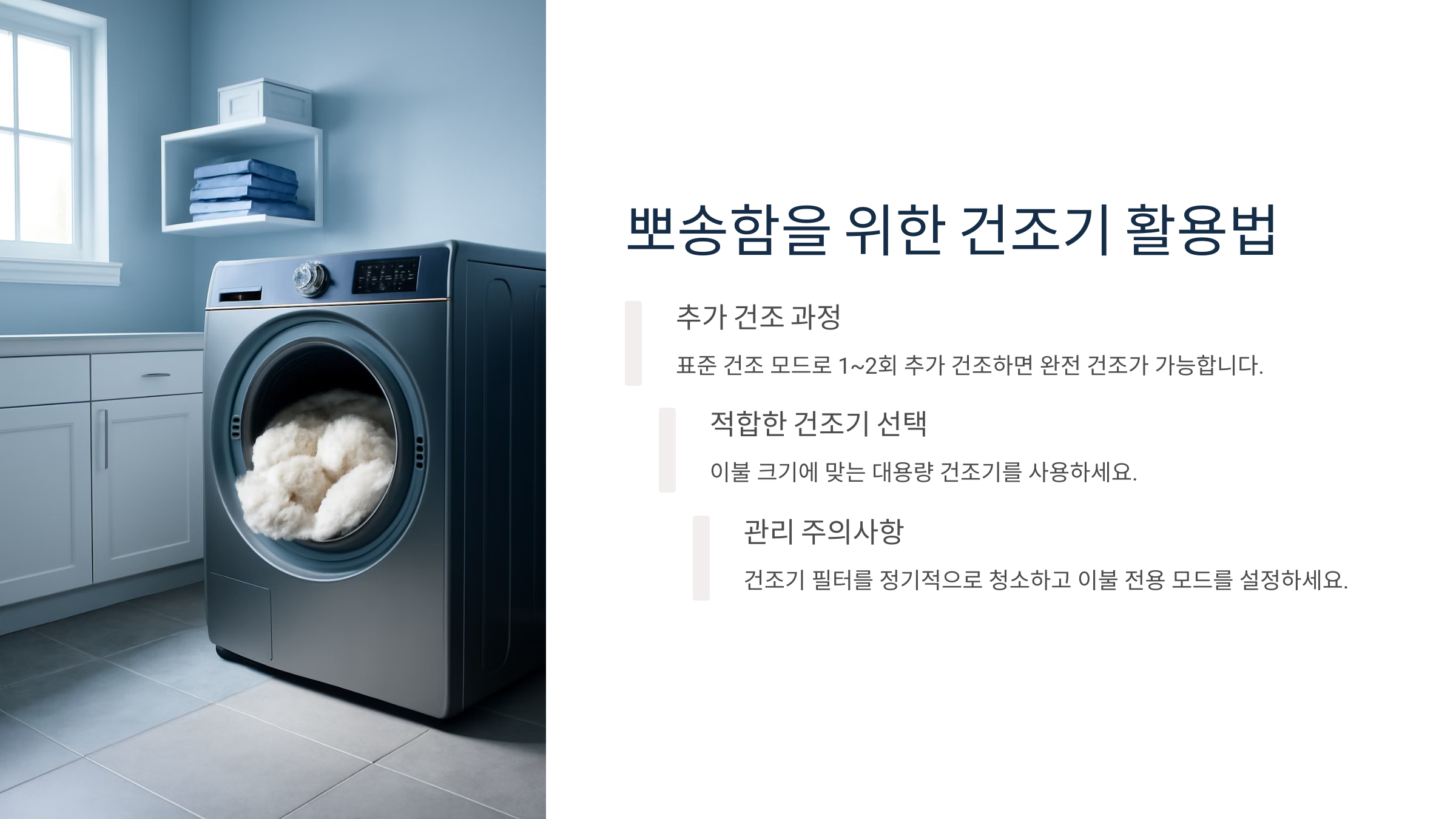 건조기가 없을 땐 마치 야외에서 햇볕에 널어놓은 것처럼 뽀송한 이불을 만드는 기술이 필요해요.