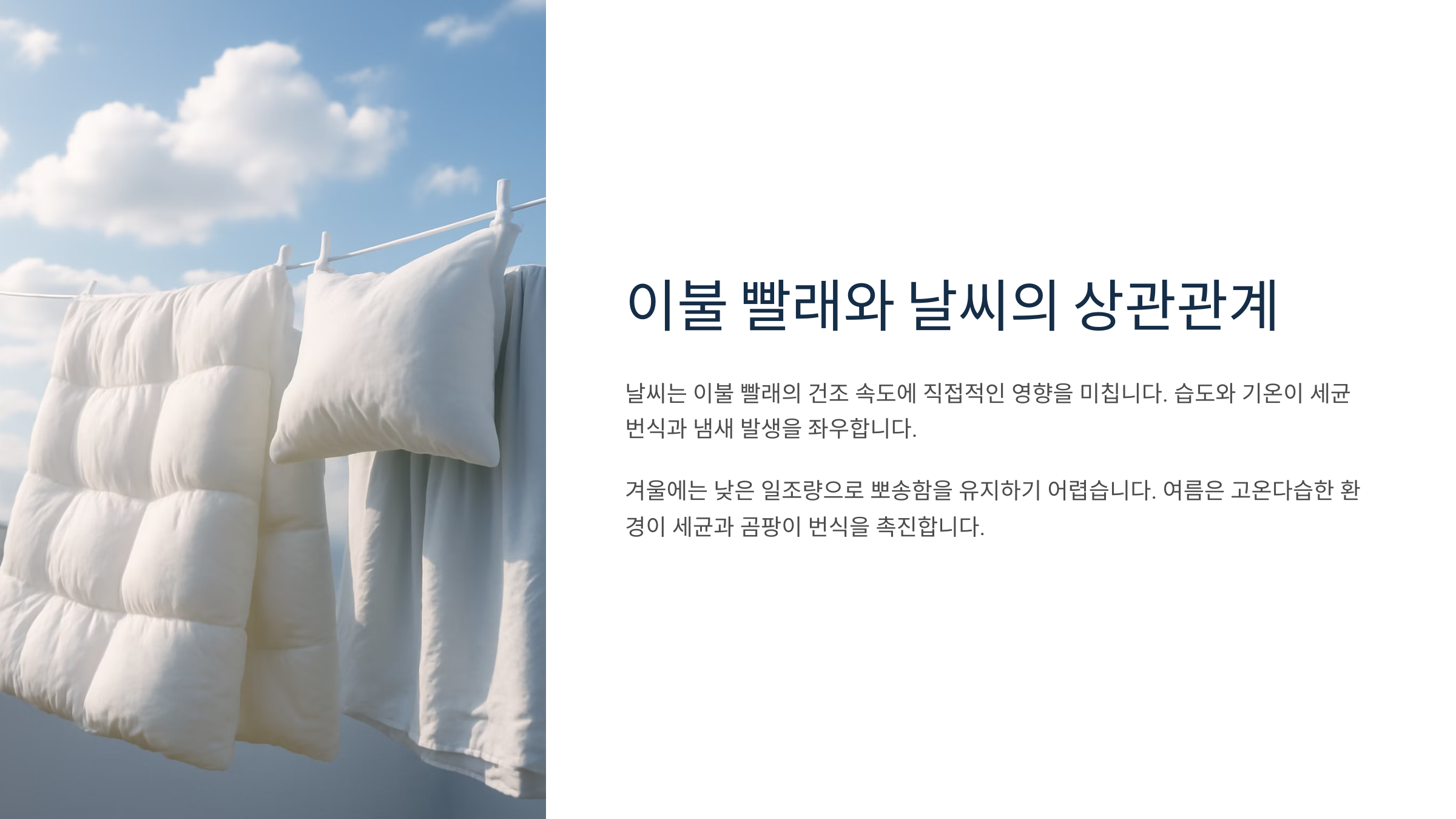 제가 생각했을 때 이불 빨래의 가장 큰 문제는 ‘건조 환경’에 따라 결과가 크게 달라진다는 점이에요. 같은 세탁이라도 어떤 방식으로, 어떤 환경에서 말리느냐에 따라 결과는 완전히 달라져요.