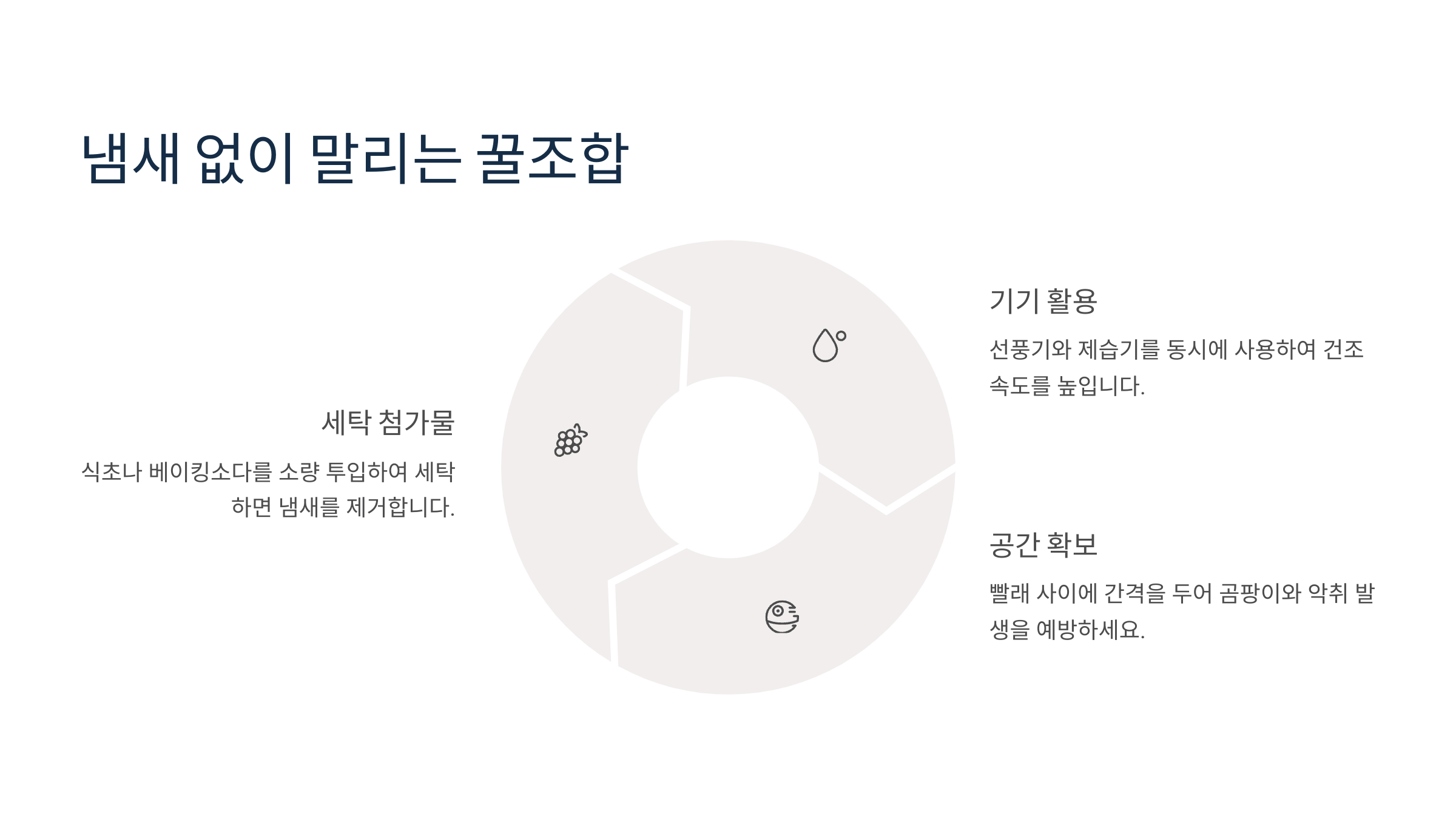 냄새를 없애기 위한 첫 단계는 세탁 단계부터예요. 세제는 향이 강한 것보단 항균력이 높은 중성세제를 쓰는 게 더 좋아요.