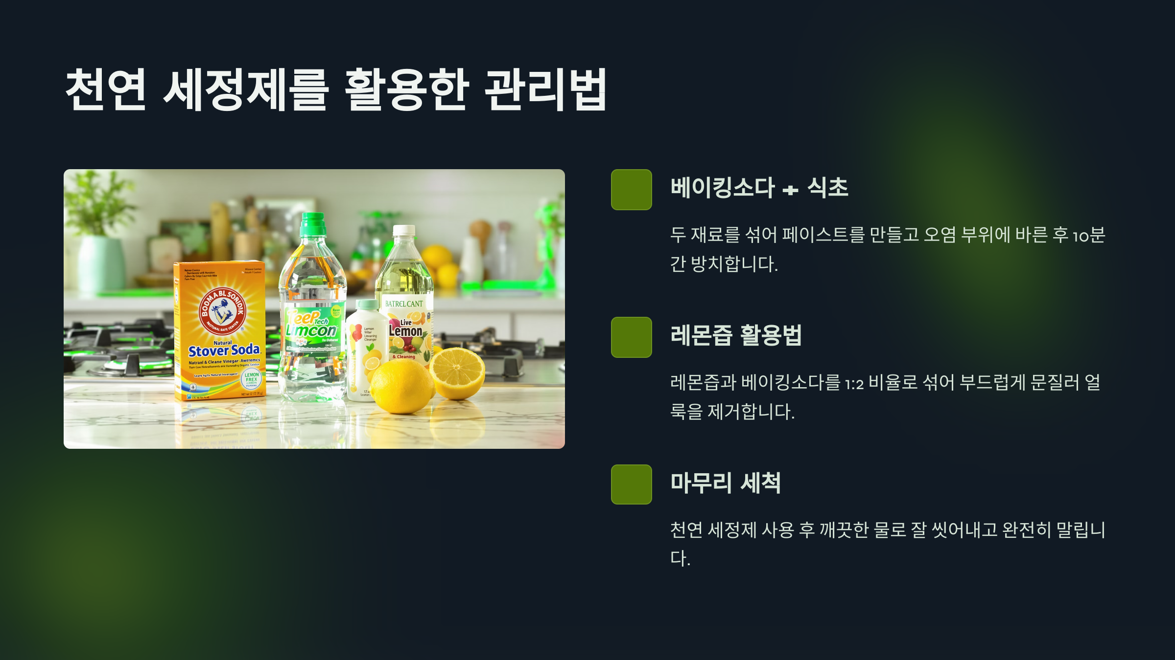이런 천연 재료들은 피부 자극도 적고, 아이들이 있는 집에서도 안심하고 사용할 수 있어요. 단, 주기적인 관리에 적합하고 찌든 때가 심한 경우엔 전용 세정제와 병행하는 게 효과적이에요.