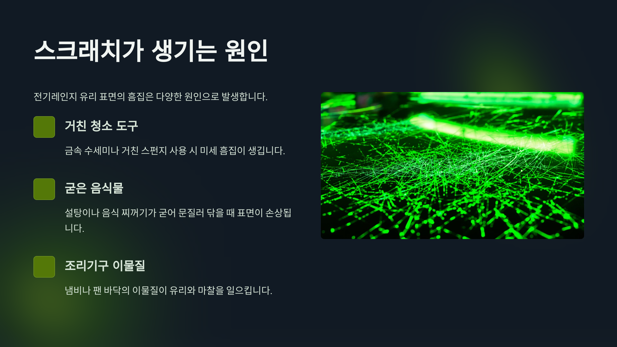 전기레인지 유리 상판에 스크래치가 생기는 가장 큰 이유는 생각보다 사소한 실수에서 시작돼요. 많은 사람들이 조리 중 냄비나 팬을 미끄러뜨리듯 옮기곤 하는데요, 그 과정에서 바닥에 붙은 작은 입자들이 유리를 긁어버리죠.