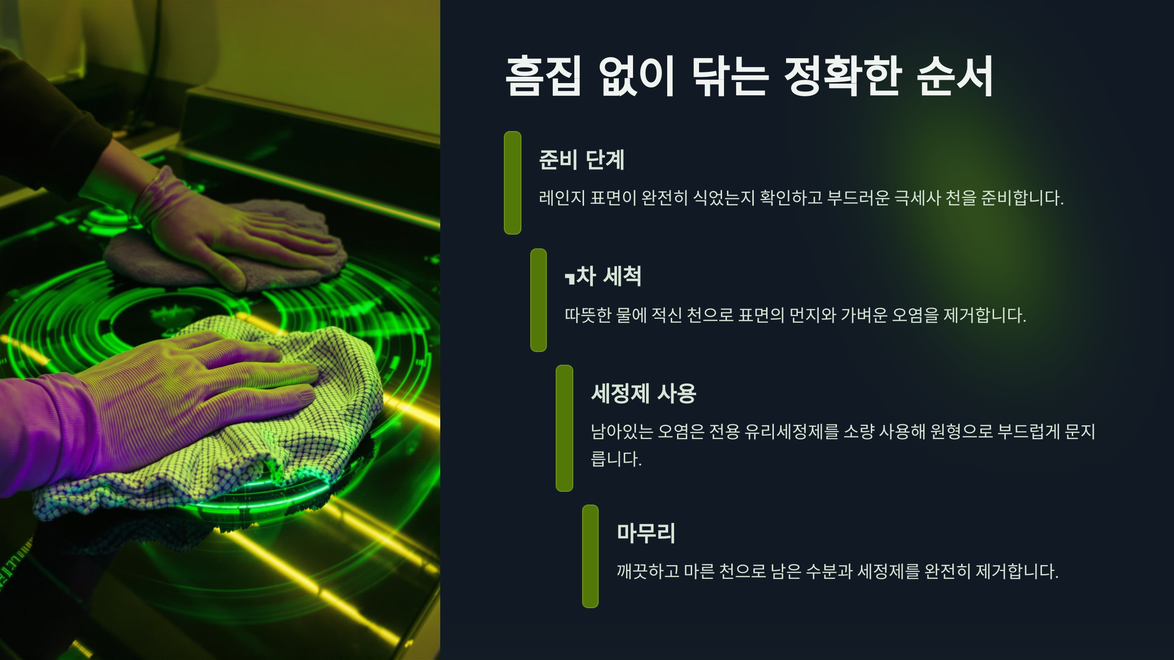 전기레인지 유리 상판은 겉보기엔 단단하지만 의외로 섬세하게 다뤄야 해요. 흠집 없이 닦으려면 순서가 정말 중요하답니다. 순서만 제대로 지켜도 광택은 유지되고 수명도 오래가요.