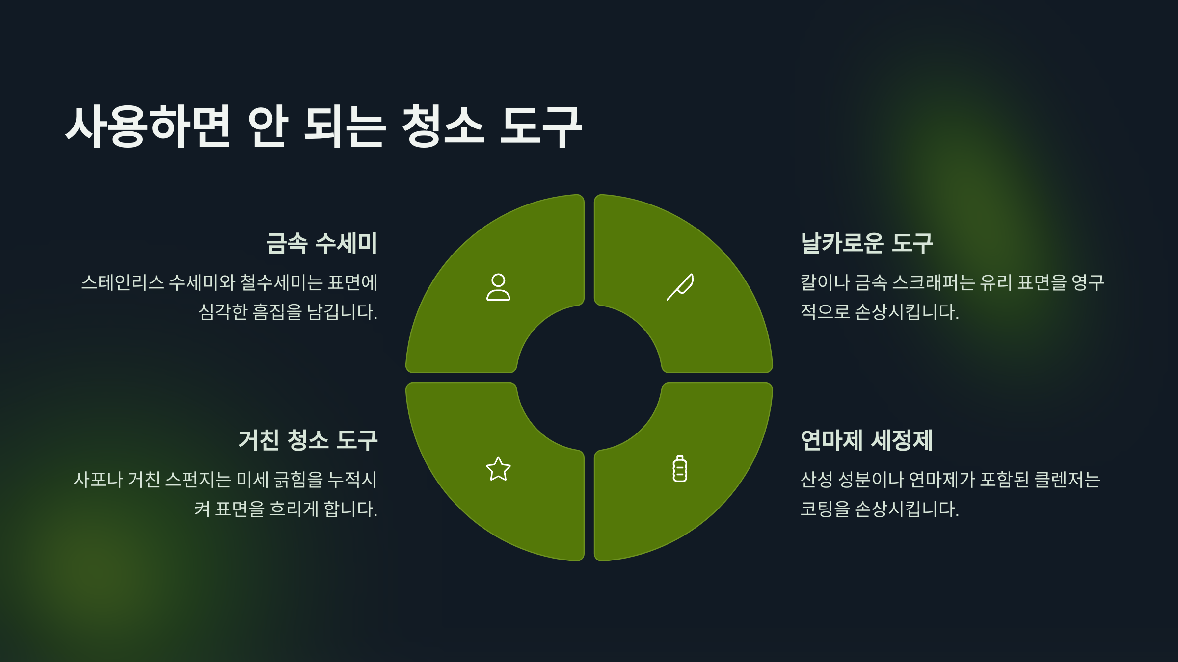 '내가 생각했을 때' 가장 흔한 실수는 세라믹 표면이 단단하다고 믿고, 아무 도구로나 닦는 습관이에요. 이건 정말 유리에게는 고문 같은 행동이거든요. 😢