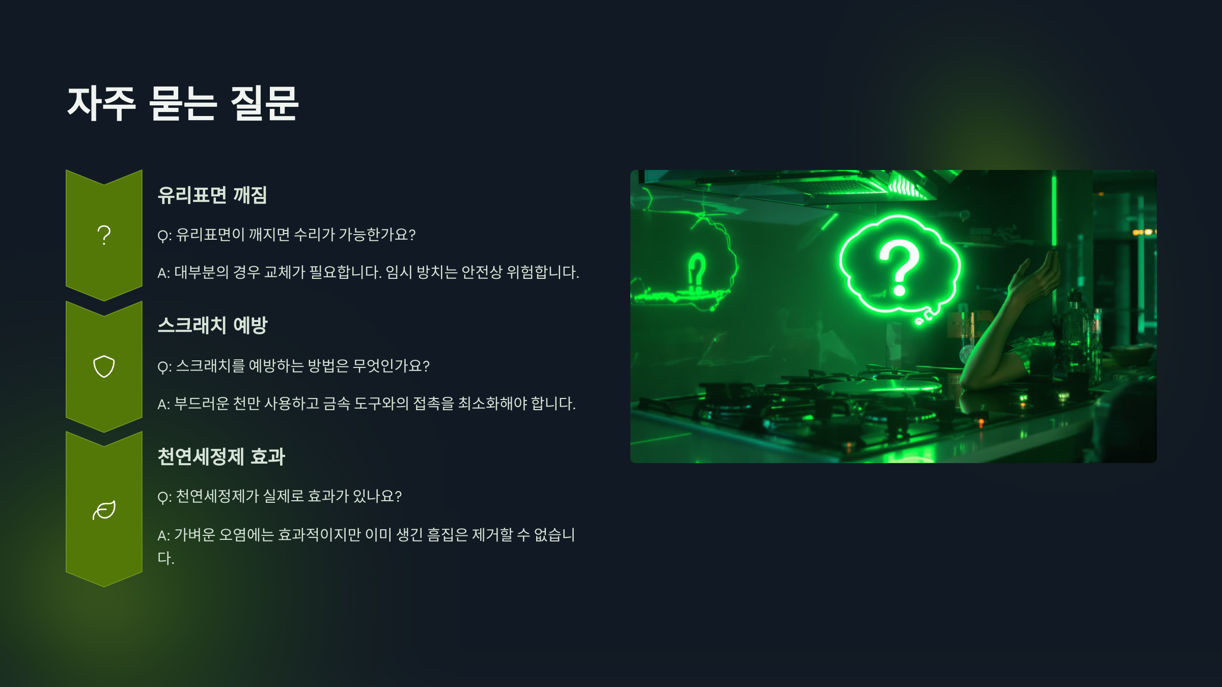 A5. 효과적인 관리를 위해 추천해요. 일반 주방 세제로는 제거되지 않는 자국이나 광택 복원이 필요할 때 유리 전용 제품이 훨씬 안전하고 효과적이에요.