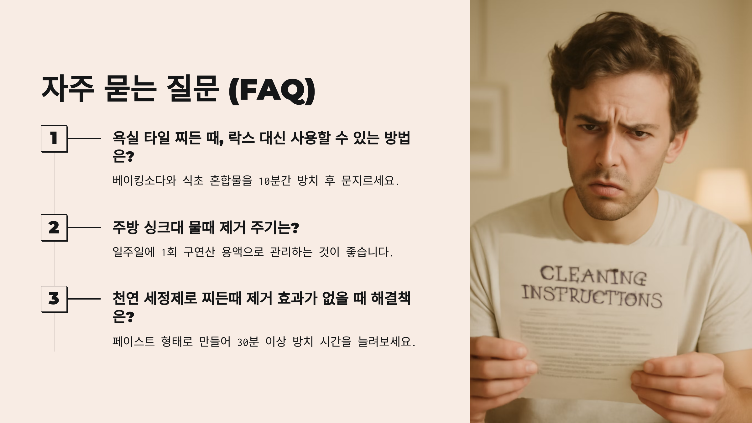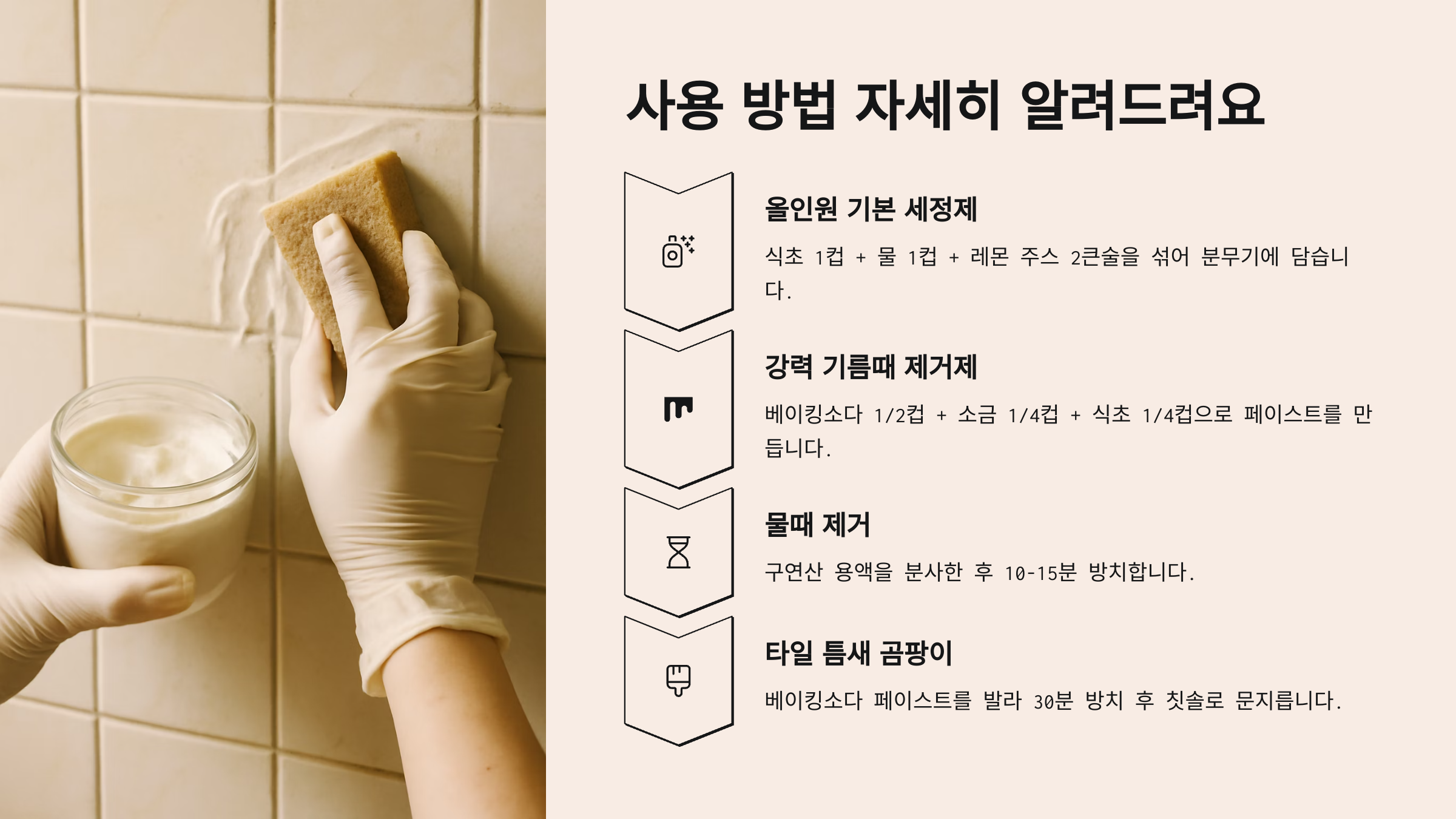 이 조합은 찌든 기름때에 강력한 만큼, 피부에 직접 닿지 않도록 장갑 착용은 필수예요. 예민한 피부는 자극을 받을 수 있어요.
