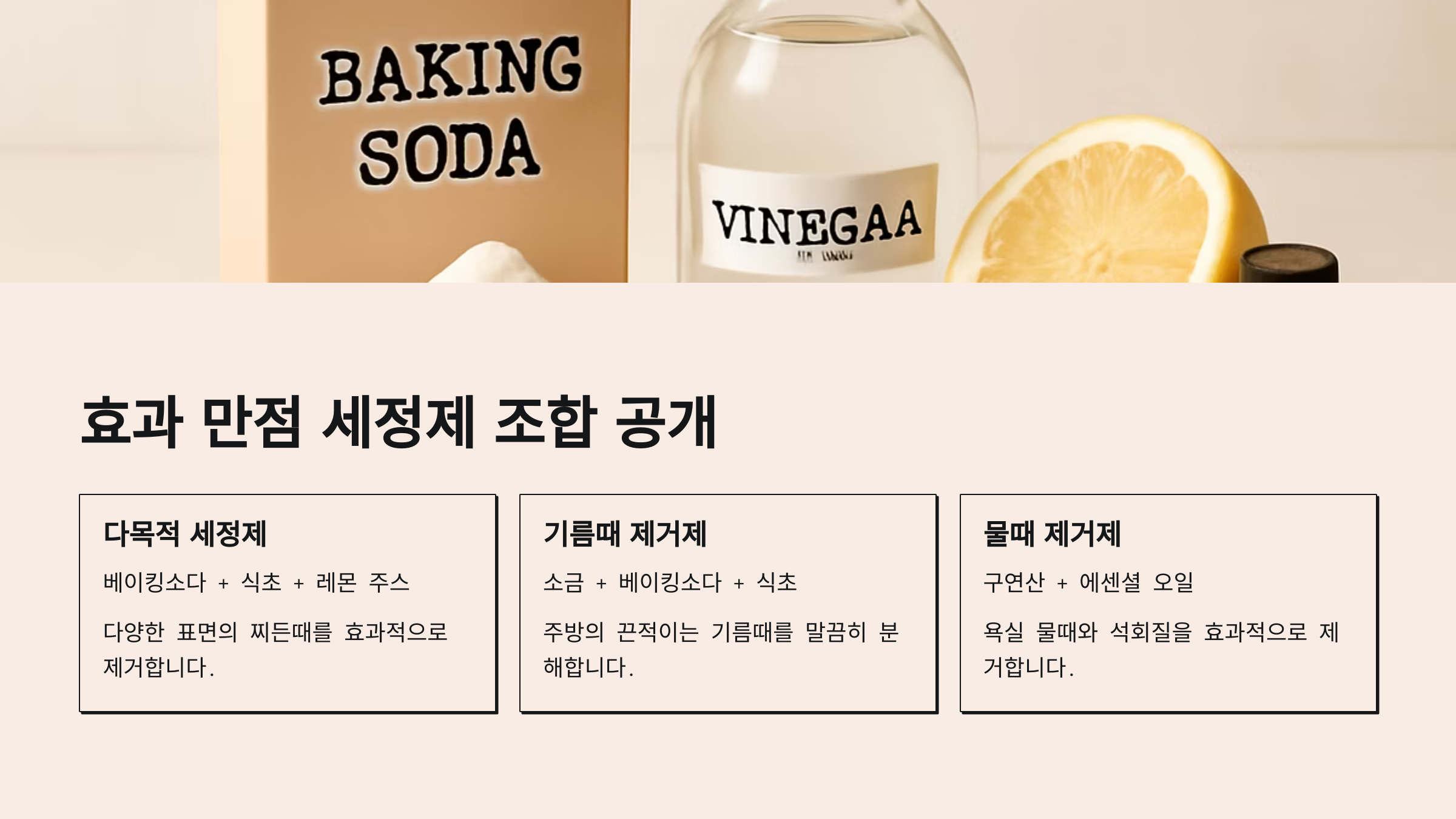 | 베이킹소다 + 식초 + 세제 | 기름때 녹이고 살균 효과까지 |