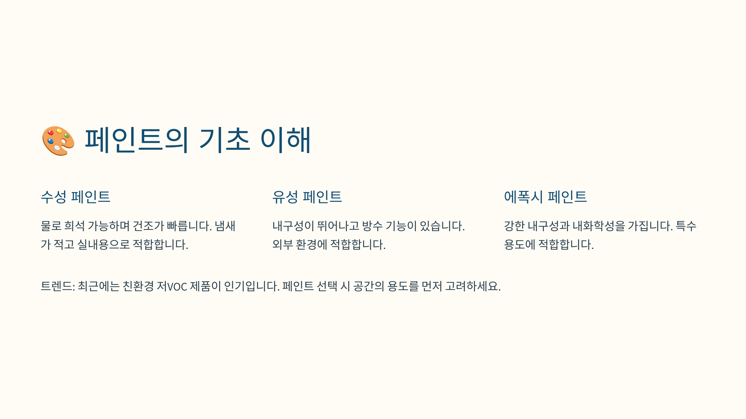 | 유성 페인트 | 내구성 좋음, 냄새 강함 | 문틀, 철제, 외벽 |