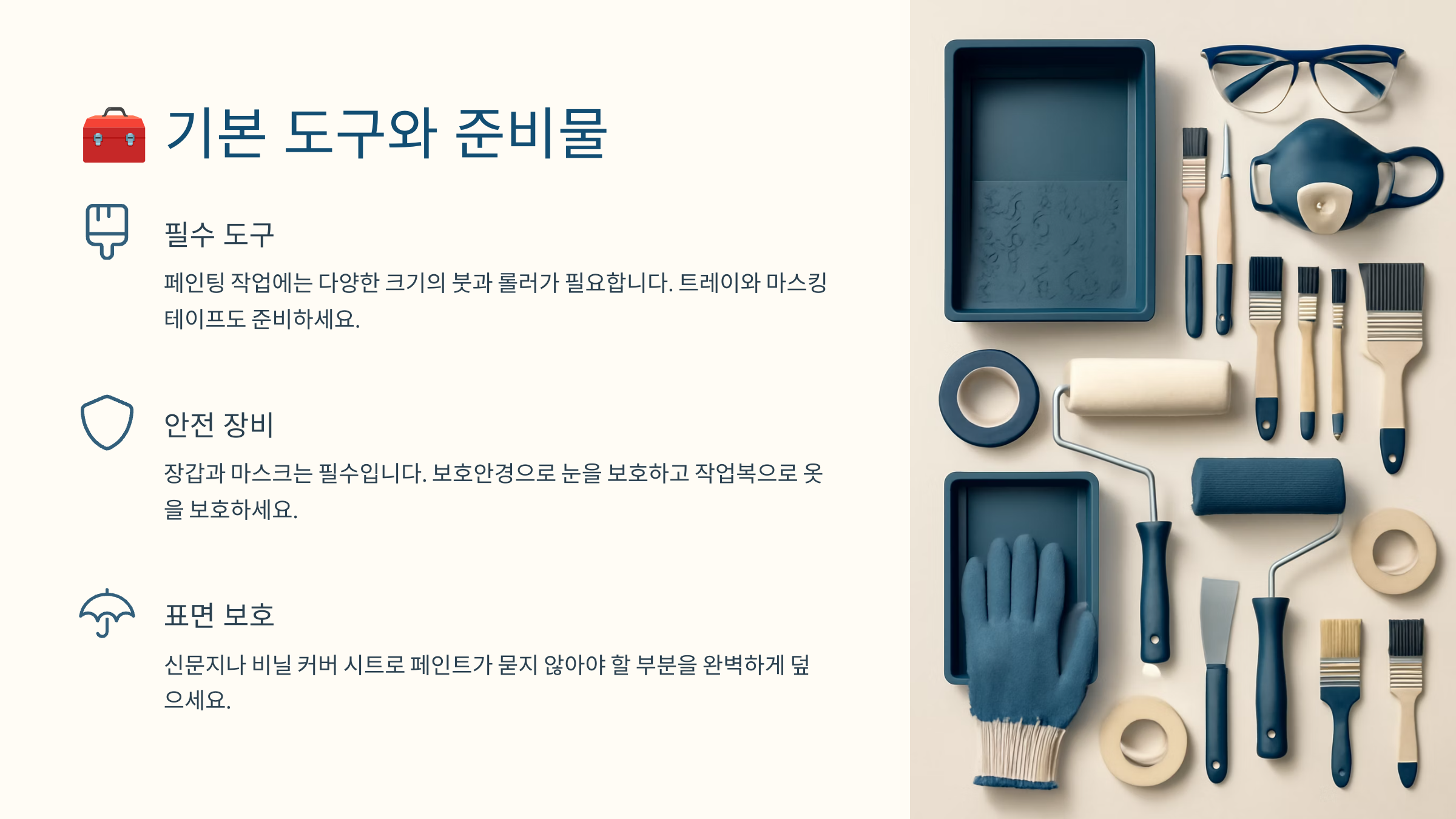 페인트칠을 하기 전에 꼭 챙겨야 할 준비물이 있어요. 이 도구들이 없다면 작업 중간에 멈추게 되거나, 원하는 결과를 얻기 어려울 수 있거든요. 😥