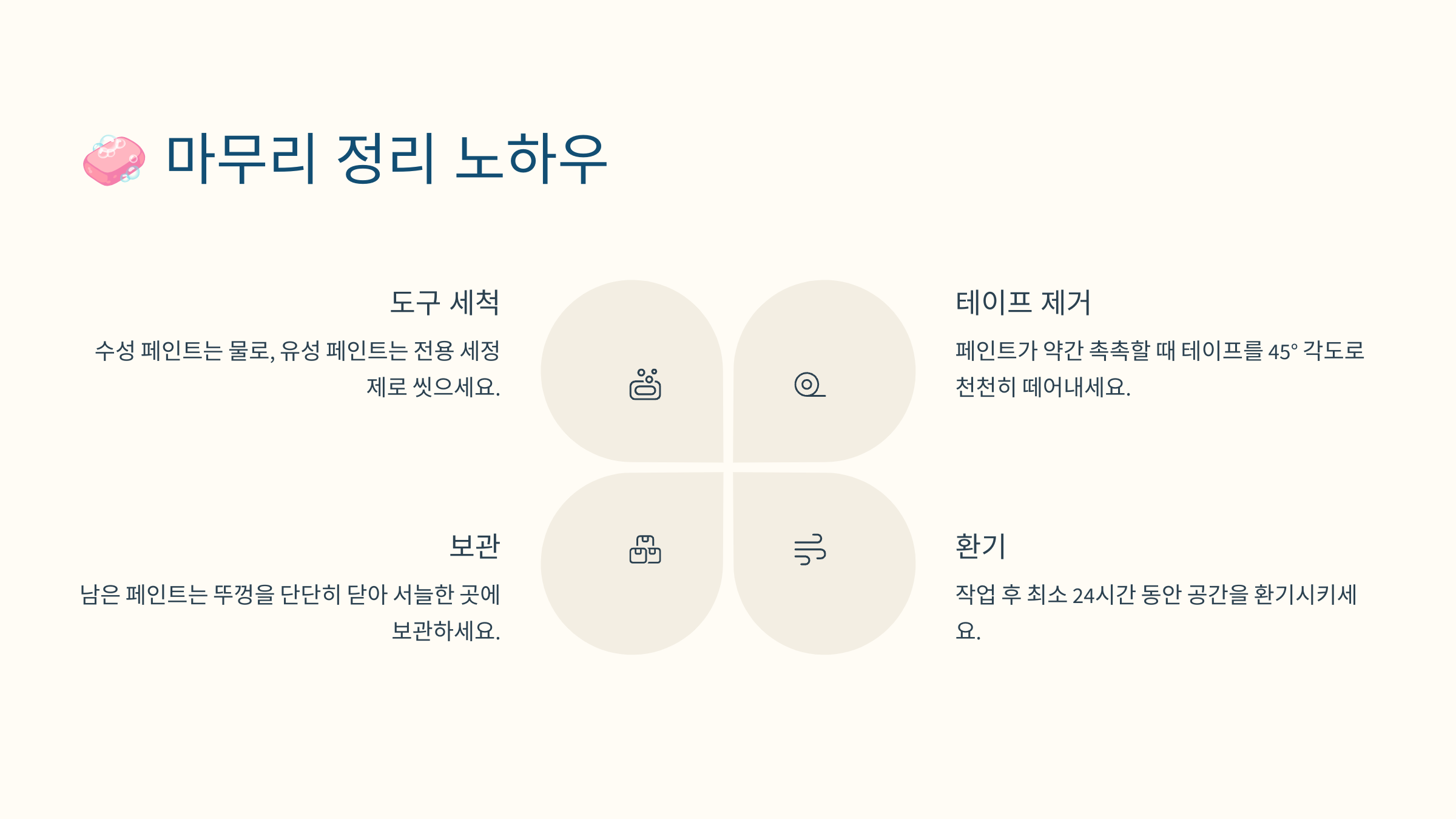 페인트칠이 끝난 후에도 중요한 일이 하나 남아있어요. 바로 '정리'예요. 작업이 끝난 직후 정리를 잘해야 다음에 또 부담 없이 할 수 있고, 공간도 깨끗하게 유지할 수 있답니다. 🧽