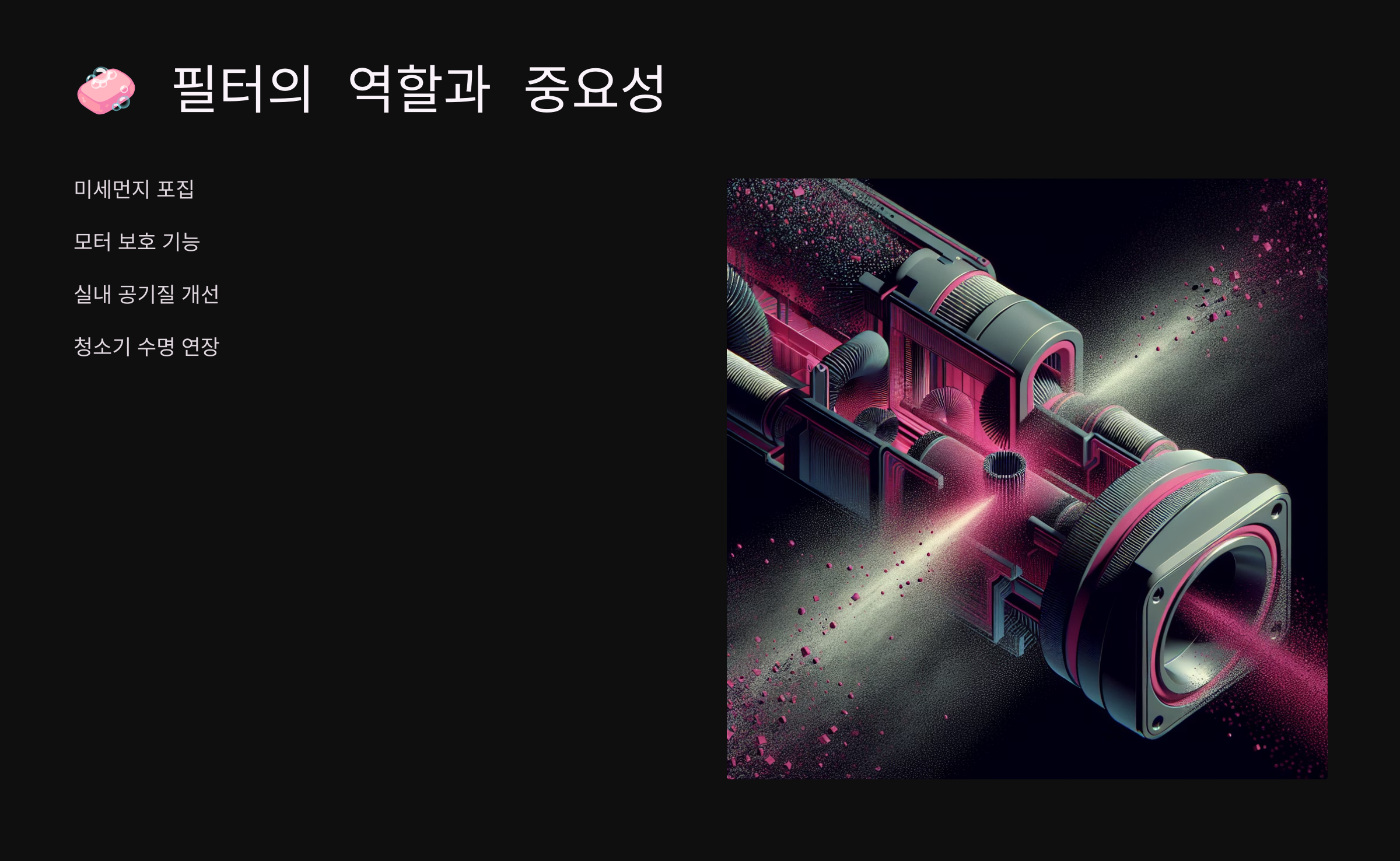하지만 그 중에서도 가장 치명적인 문제는 '필터 막힘'이에요. 필터는 미세먼지를 걸러주면서도 공기가 원활히 통과해야 하는데, 이 균형이 무너지면 바로 흡입력이 급격히 감소하죠.