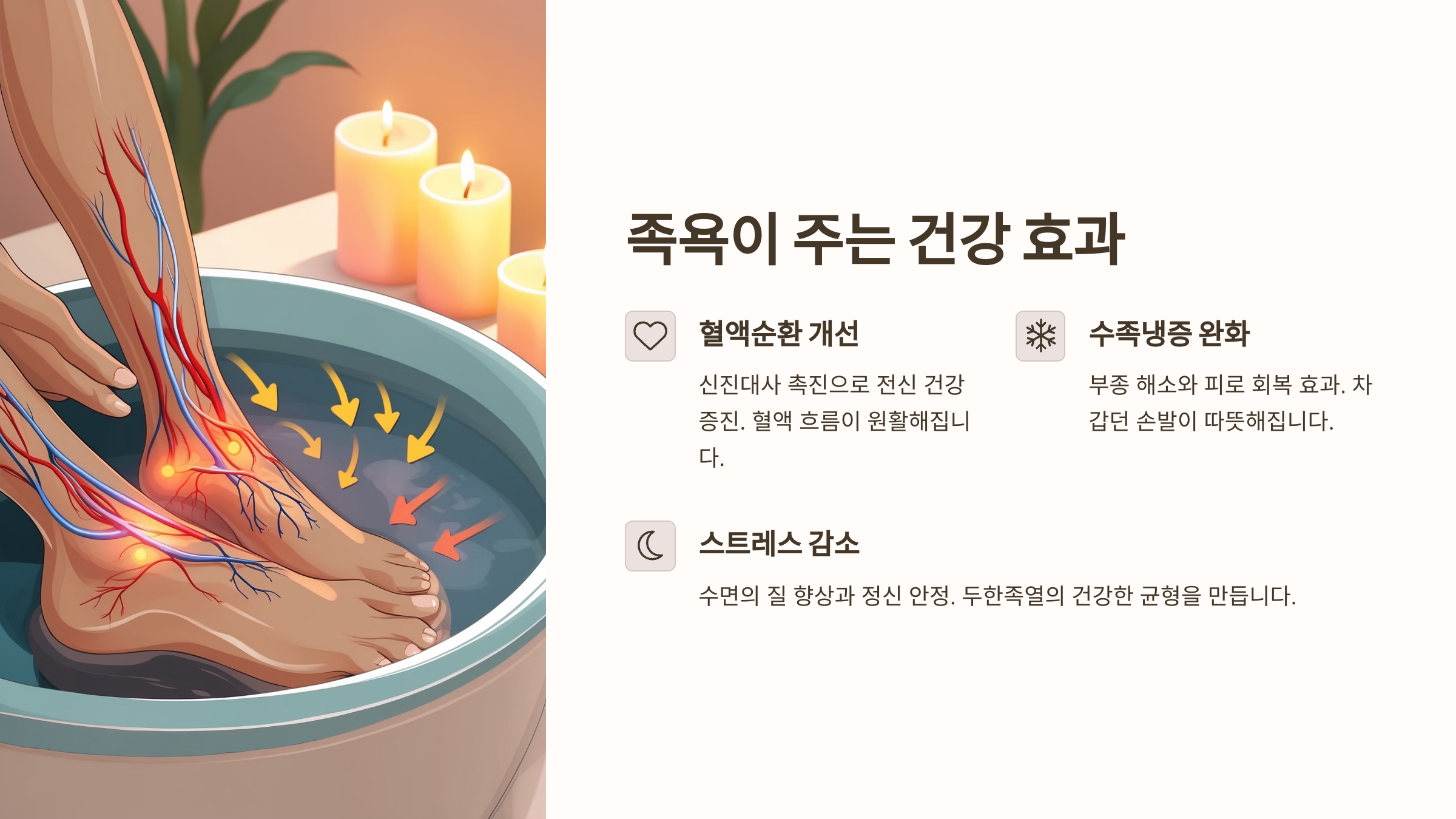 가장 대표적인 효과는 혈액순환 개선이에요. 따뜻한 물에 발을 담그면 말초 혈관이 확장돼서 몸 전체 순환이 활발해지죠.