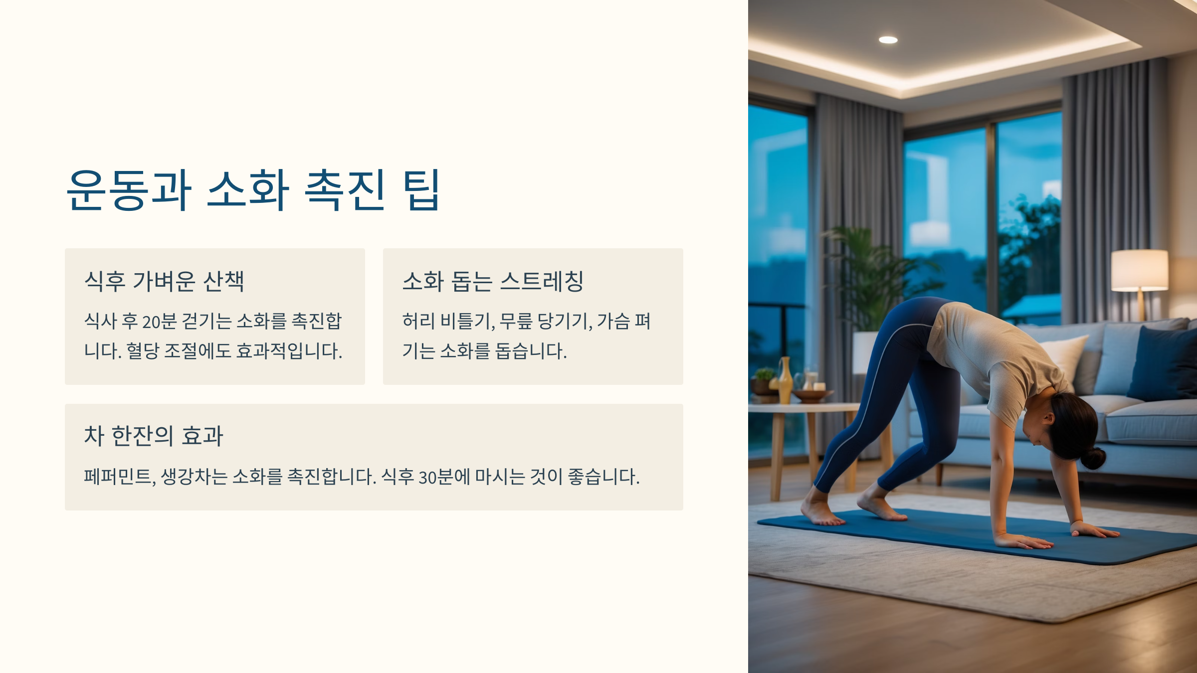 | 가벼운 요가 | 복부와 소화기관 자극 | 5~10분 |