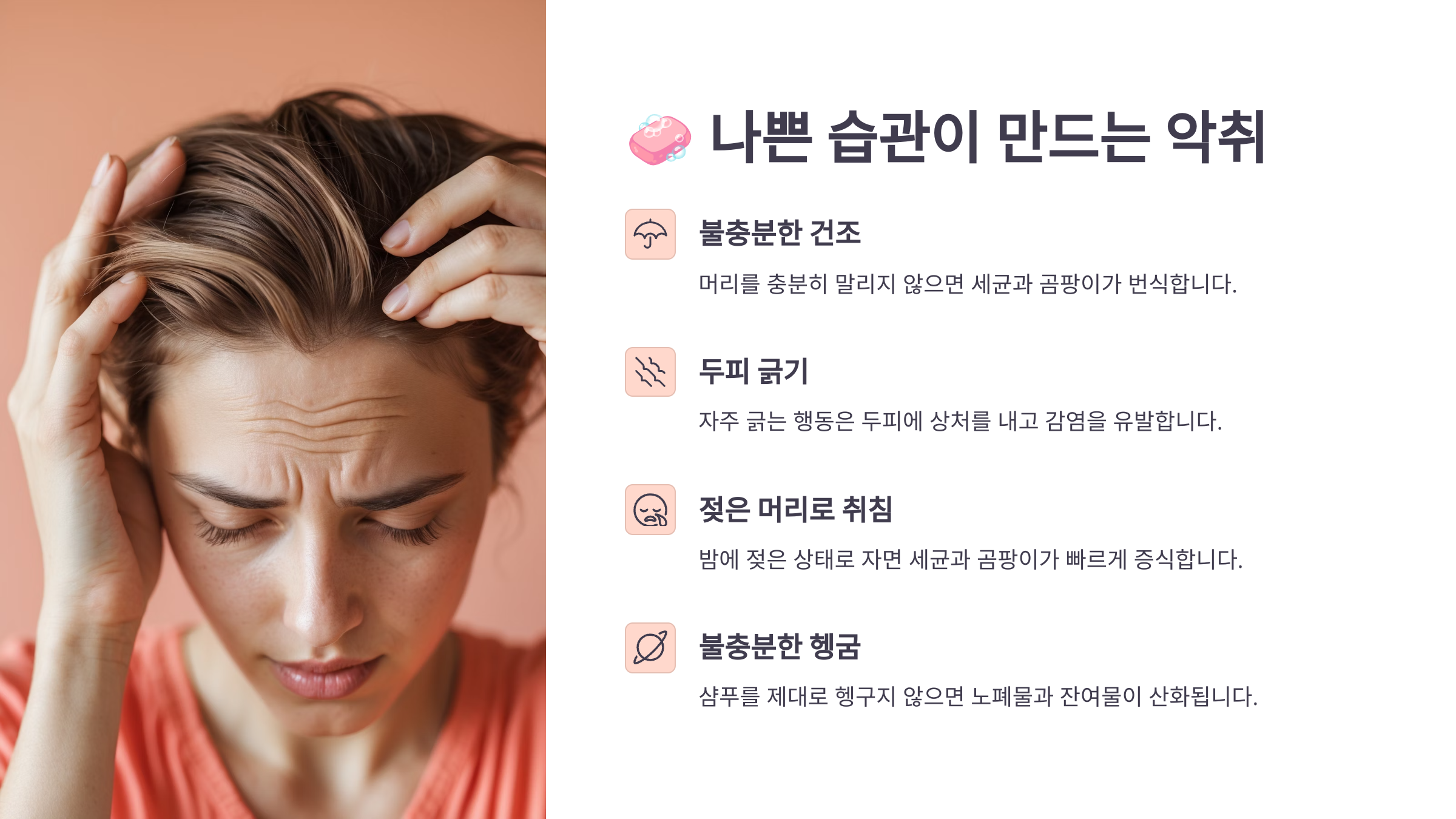 A1. 두피 세정이 제대로 되지 않거나 말리는 과정이 부족해서 그래요. 특히 피지, 잔여물, 습기가 남아 있으면 냄새가 날 수 있어요.