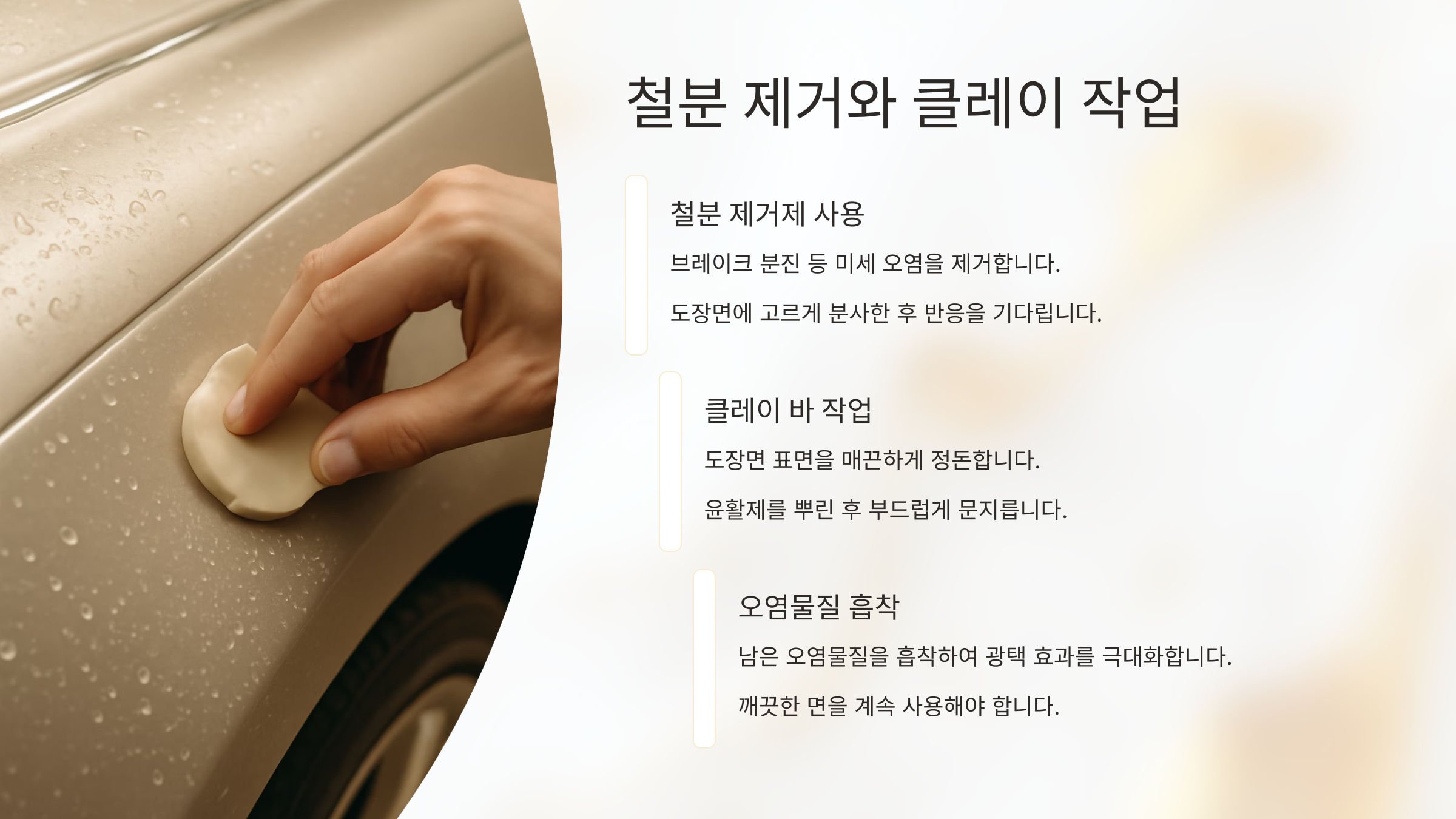 세차를 마친 차량 표면을 손으로 가볍게 쓸어보면, 뭔가 오돌토돌한 느낌이 들 수 있어요. 이게 바로 철분과 타르, 수지 같은 미세 오염물들이 도장면에 박혀 있는 상태예요. 이걸 그냥 폴리싱하거나 왁스를 바르면 오히려 스크래치가 생기고 결과도 탁해져요. 그래서 반드시 클레이 작업이 필요해요.