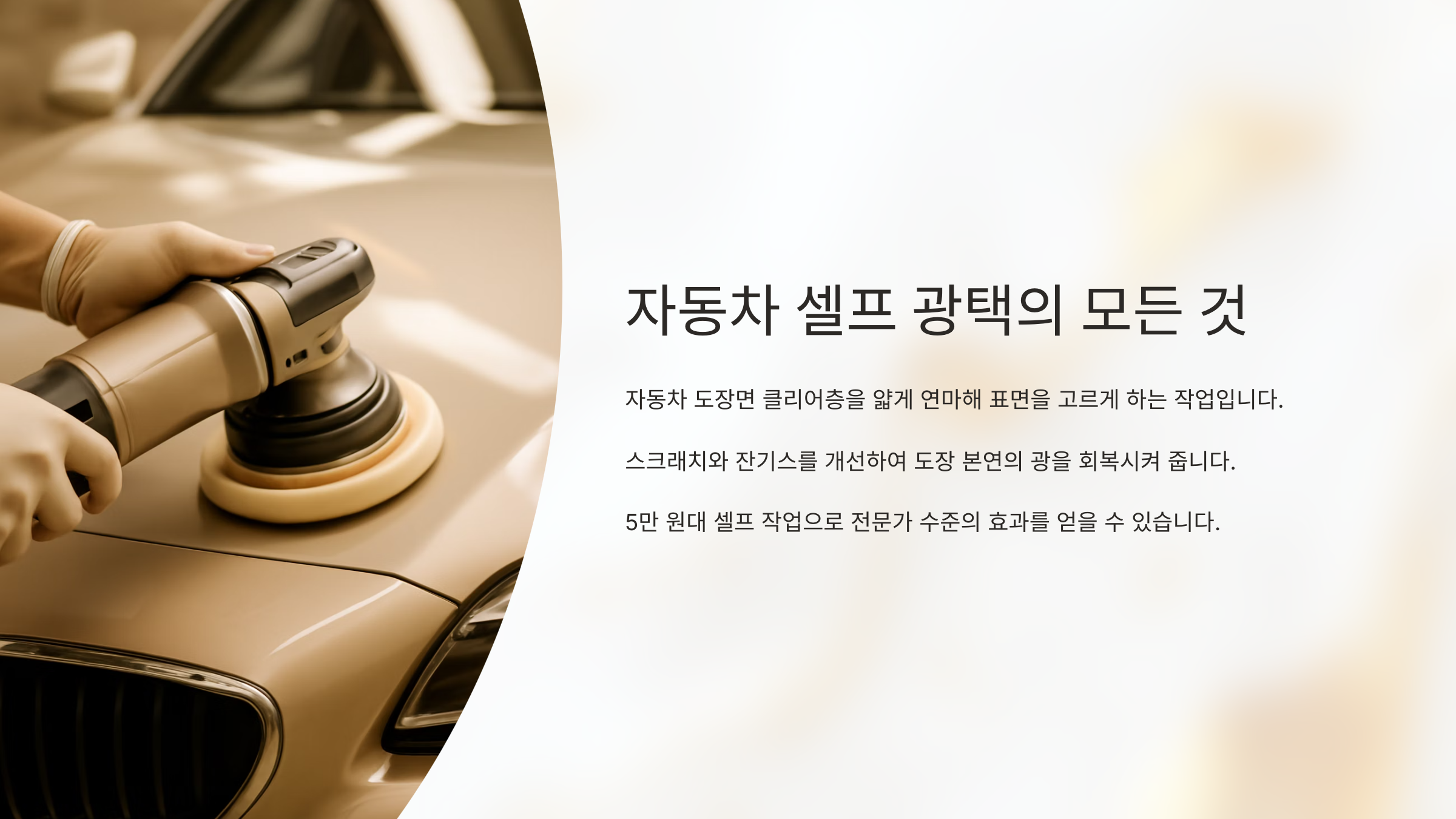 요즘은 초보자용 폴리셔도 쉽게 구할 수 있고, 간단하게 문지르기만 해도 광이 나는 제품도 많아서 셀프로도 충분히 퀄리티 있게 작업할 수 있어요. 단, 모든 광택 작업은 ‘과유불급’이니까 적당한 압력과 정성으로 하는 게 포인트예요. 💪